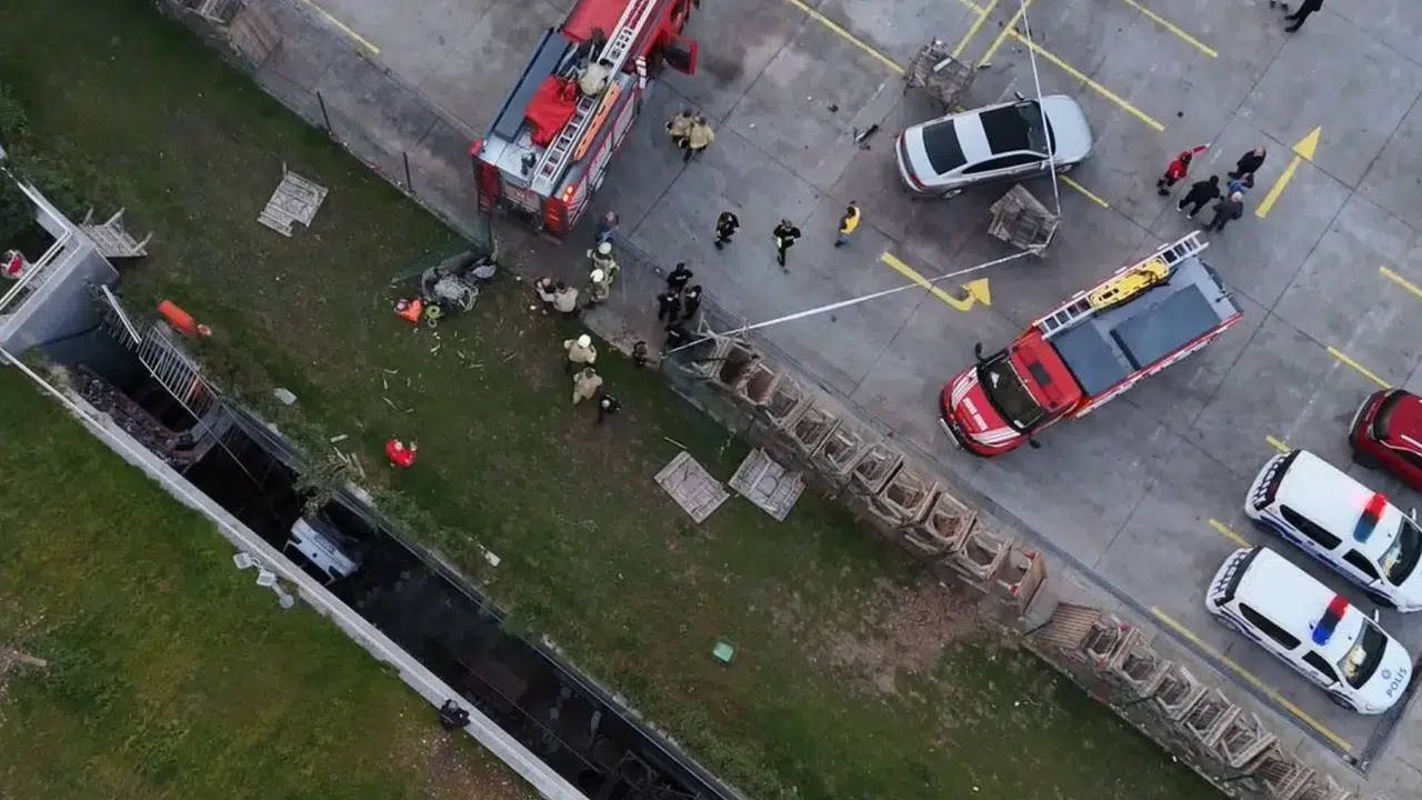 Otoparktan çıkan kadın sürücü araçlara çarparak boşluğa düştü. Araçta sıkışan sürücüyü itfaiye kurtardı. Boşluğa düşen araç ve çalışmalar havadan görüntülendi