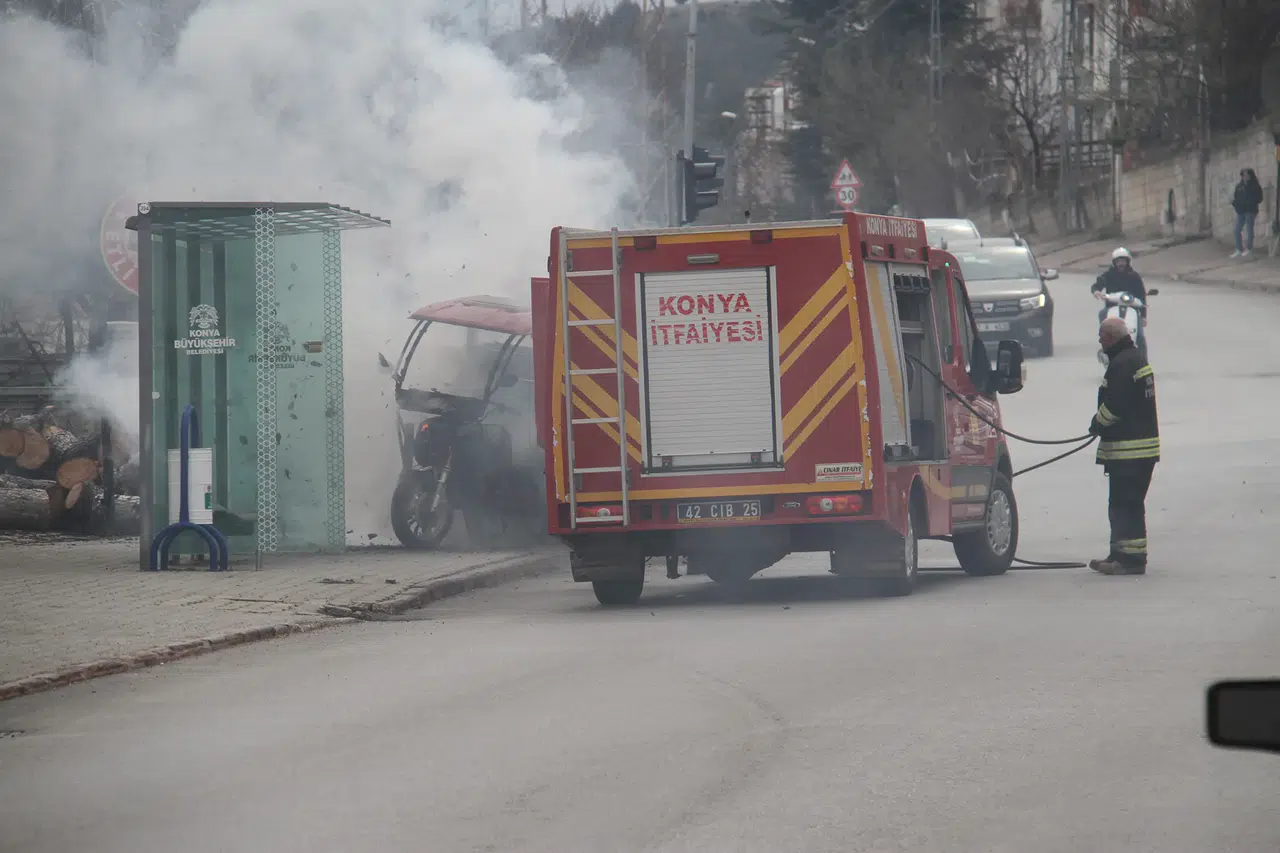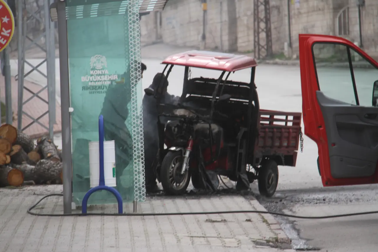 Konya'nın Beyşehir ilçesinde park halindeki elektrikli üç tekerlekli motosiklet alev alev yandı. O anlar kameraya yansırken, sürücü ve çevredekiler korku ve panik yaşadı. Olay, Hacıakif Mahallesi, Özdilek Caddesi üzerinde meydana geldi.