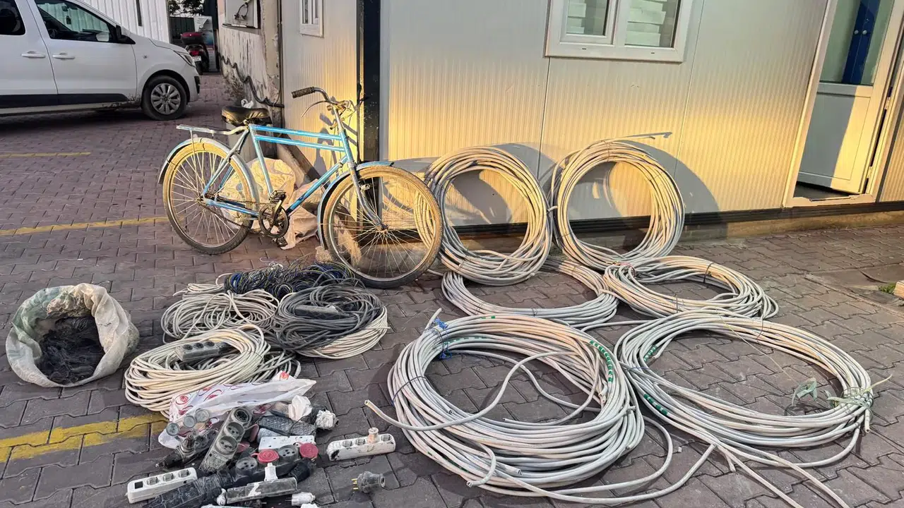 Şüphelinin çalıntı bisikletle gelerek bir inşaat alanından kablo çaldığı anlar saniye saniye güvenlik kameralarına yansıdı. Yapılan araştırmalar sonucunda hırsızlık olaylarının şüphelisinin S.E. (28) olduğu belirlendi. Polis ekiplerince düzenlenen operasyonda şüpheli kısa sürede yakalanırken, yanında bir adet bisiklet, 2 bin 115 metre kablo ve 47 adet uyuşturucu hap ele geçirildi. Çalınan malzemeler ise sahiplerine teslim edildi. Emniyetteki işlemleri tamamlanan S.E. çıkarıldığı adli makamlarca tutuklanarak cezaevine gönderildi.