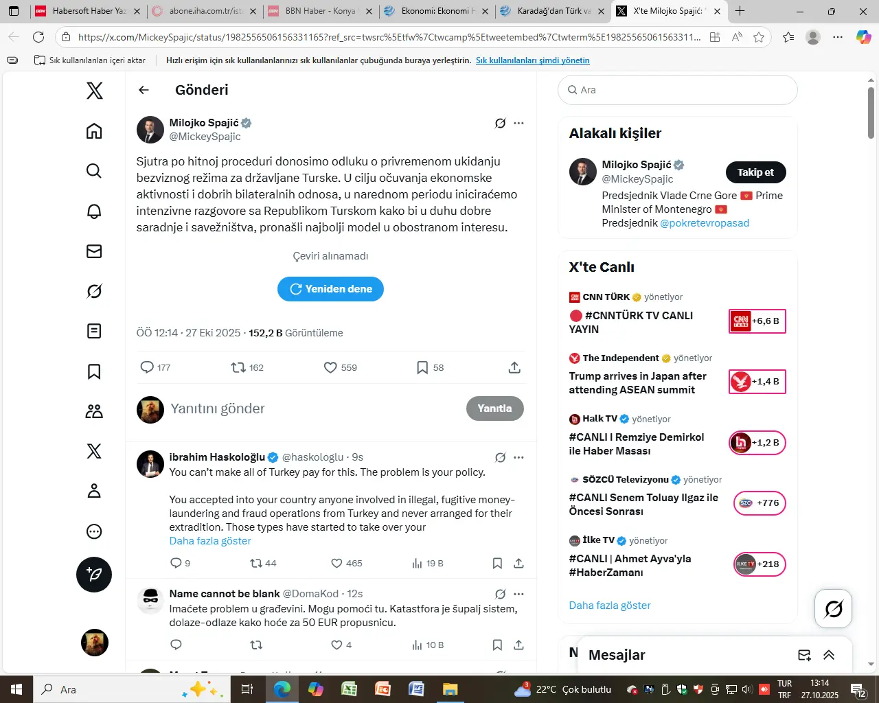 Karadağ Başbakanı Milojko Spajić, sosyal medya platformu X üzerinden paylaştığı mesajında "Yarın, acil prosedür kapsamında, Türkiye Cumhuriyeti vatandaşları için vizesiz rejimin geçici olarak askıya alınmasına ilişkin bir karar alacağız." ifadelerini kullandı.