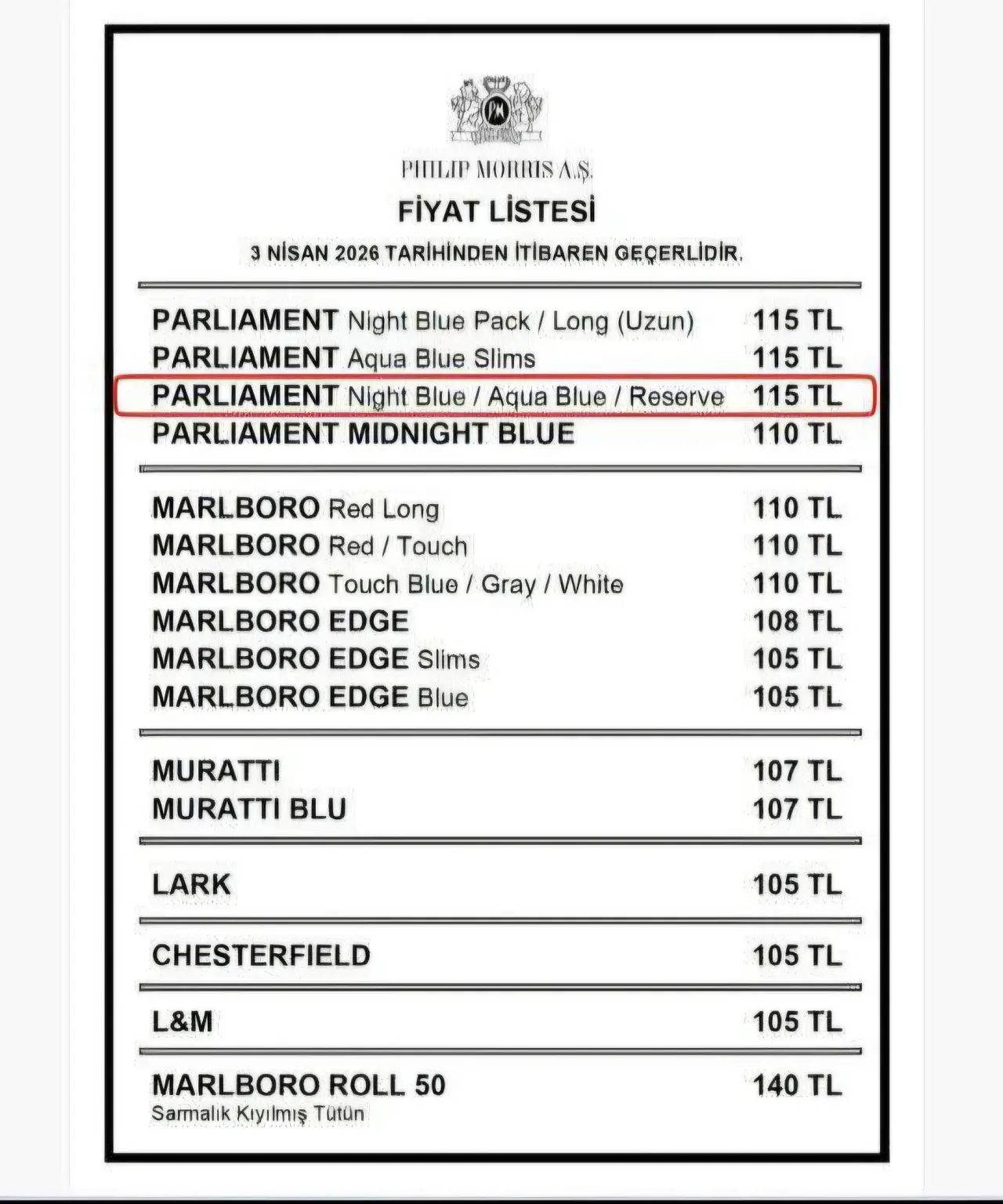 Tiryakileri üzen haber geldi. Son yayımlanan listelerde Parliament Night Blue Pack/Long ve Aqua Blue Slims 115 TL, Marlboro Edge Slims ile Edge Blue/Sky, Lark, Chesterfield ve L&M ise 105 TL seviyesinde yer alıyor. Zamla birlikte grubun en çok tercih edilen markalarında dikkat çeken artışlar yaşandı. Özellikle Parliament serisinde Night Blue, Aqua Blue ve Reserve ürünleri 115 TL’ye yükselerek rekor seviyeye ulaştı.