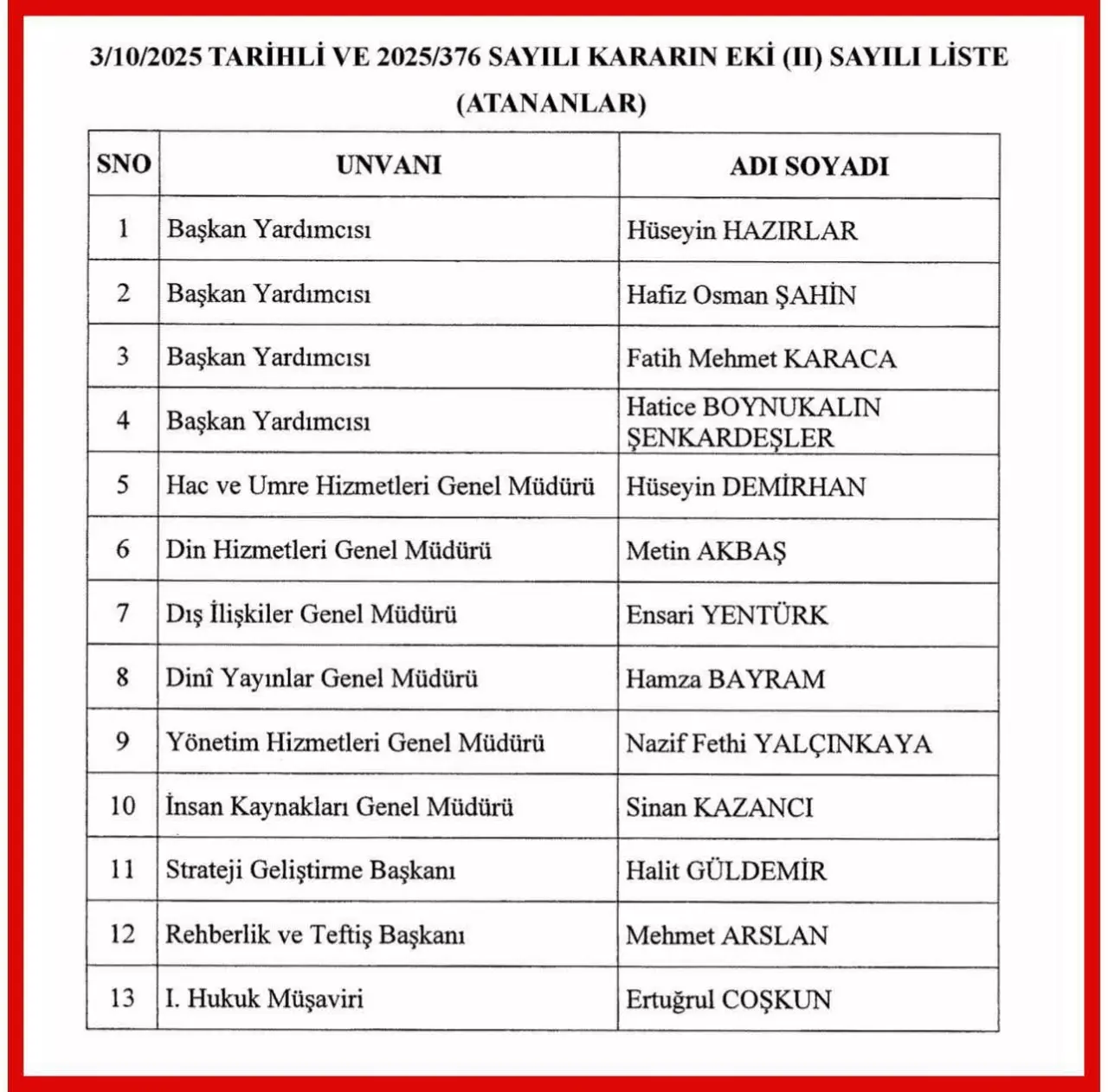 Diyanet İşleri Başkanlığı’nın üst kademlerindeki 4 Başkan Yardımcısı, Hac ve Umre Hizmetleri Genel Müdürü, Din Hizmetleri Genel Müdürü, Dış İlişkiler Genel Müdürü, Dini Yayınalar Genel Müdürü, Yönetim Hizmetleri Genel Müdüdrü, İnsan Kaynakalrı Genel Müdüdrü, Strateji Geliştirme Başkanı, Rehberlik ve Teftiş Başkanı görevden alındı ve yerlerine yeni atamalar yapıldı.