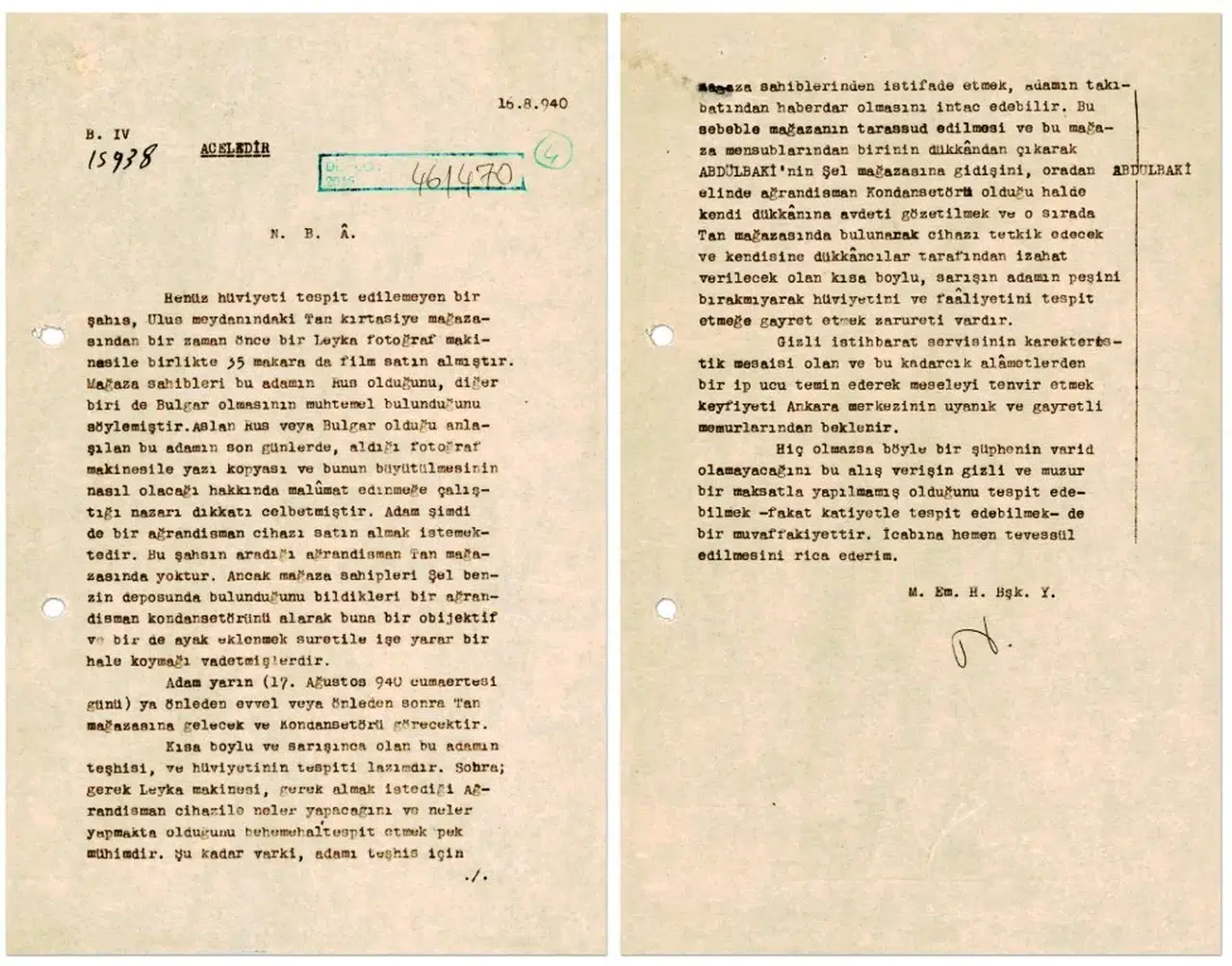 Belgede, şüpheli şahsın bir fotoğrafın büyütülerek çıkarılması için kullanılan agrandisman cihazı satın almak istemesi ve cihazın Tan kırtasiyesinde olmadığı bilgisi yer aldı. Şüphelinin yarın (17 Ağustos 1940) öğleden önce veya sonra kırtasiyeye gelip cihazı göreceği bilgisi de ayrıca belgede yer aldı.