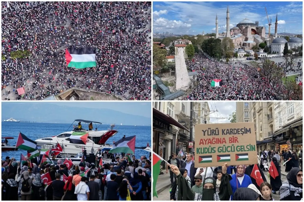 İsrail'in Gazze'ye saldırıları yurt genelindeki yürüyüşlerle protesto ediliyor. Yürüyüşlere katılan on binlerce kişi Gazze'ye destek sloganlarıyla İsrail saldırılarını protesto ediyor. Filistin'e Destek Platformu çatısı altında bir araya gelen binlerce kişi Ayasofya Camisi önünde toplandı.