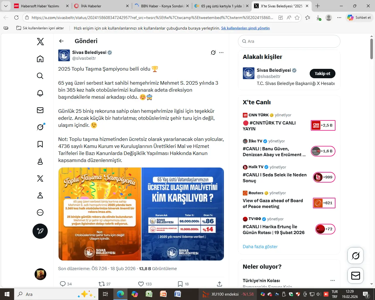 Toplu taşımada 65 yaş üzerinde ücretsiz taşımada rekor kırıldı. Sivas'ta bir kişi, bir yılda 3 bin 365 kez ücretsiz kartı kullandı, günde bazen 25 kez bu kartla otobüse bindi.