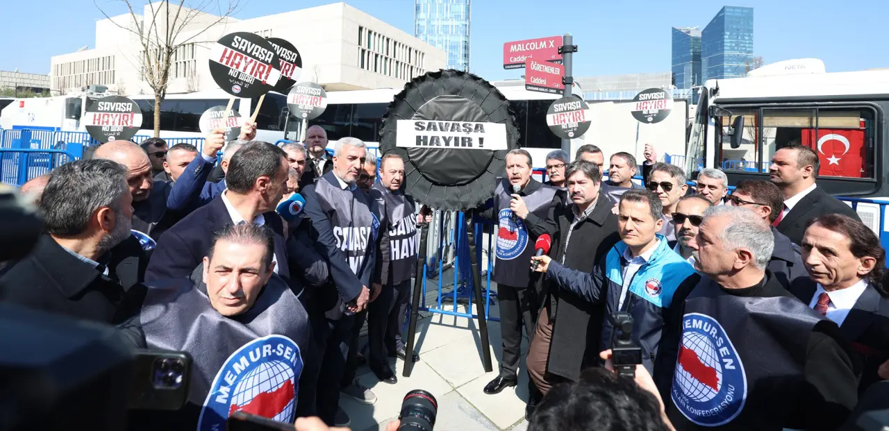 Memur Sendikaları Konfederasyonu (Memur-Sen), ABD ve İsrail'in İran'a yönelik saldırılarını ABD'nin Ankara Büyükelçiliği önüne siyah çelenk bırakarak protesto etti. Büyükelçilik önünde bir araya gelen Memur-Sen üyeleri, ‘Savaşa hayır' yazılı yelekler giydi, dövizler taşıdı.