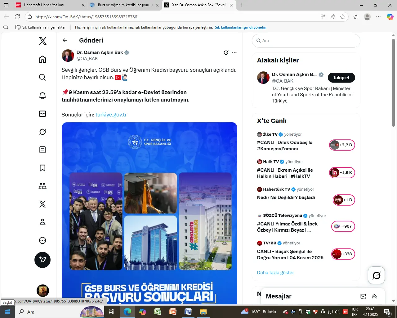 Gençler günlerdir bekliyordu… Gençlik ve Spor Bakanı Osman Aşkın Bak, GSB Burs ve Öğrenim Kredisi başvuru sonuçlarının açıklandığını duyurdu.