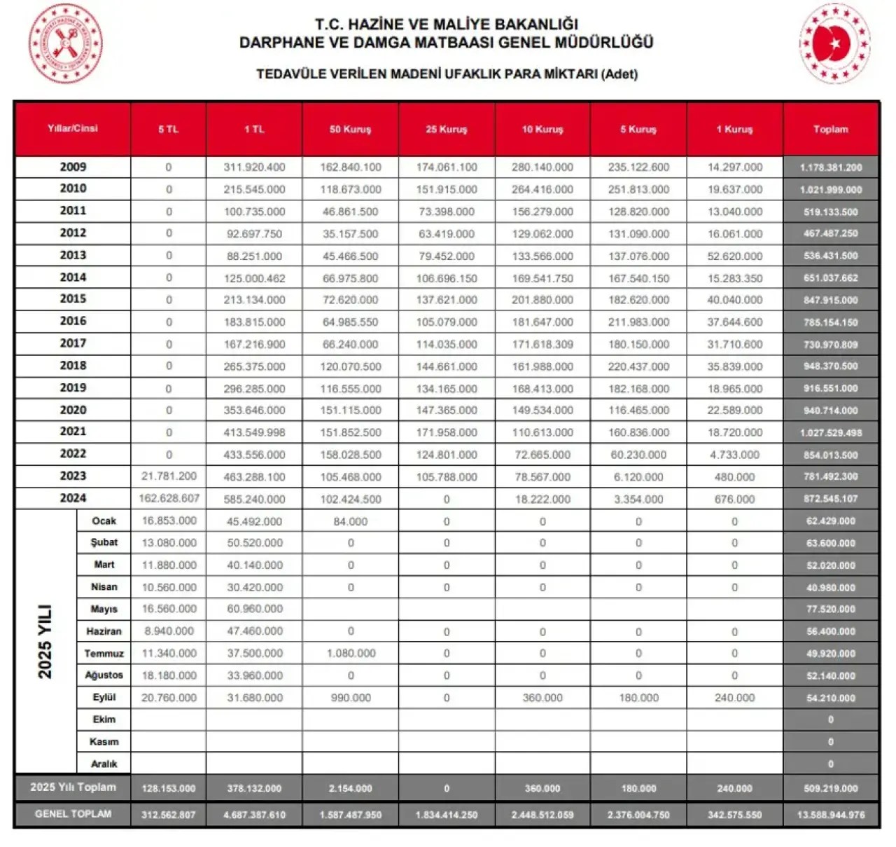 Bu yıla (2025) ait verilerde toplamda 509 milyon 219 bin liralık madeni ufaklık para birimi basıldığı açıklandı. Yeni Türk Lirası YTL'nin kaldırılması ve TL olarak devam ettirilmesi nedeniyle 2009 yılından bu yana basılan ve tedavülde olan 13 milyar 588 milyon 944 bin 976 liralık madeni ufaklık para piyasada dolaşım halinde bulunuyor.