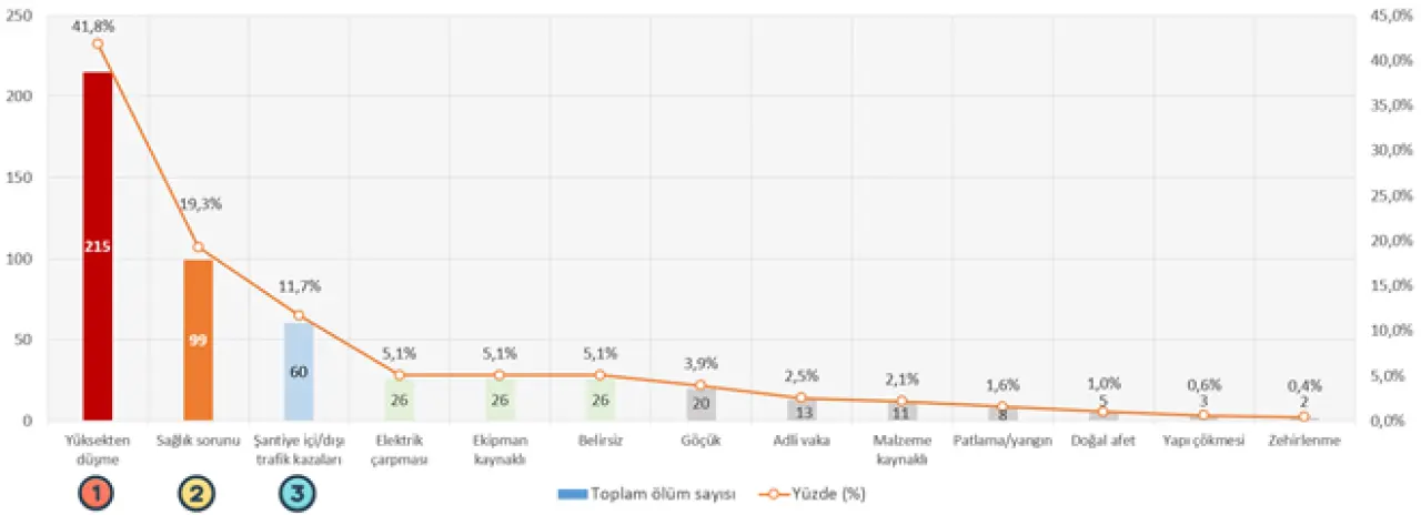 Önceki dönemlerde olduğu gibi yüksekten düşme kaynaklı ölümler (215) ilk sıradaki yerini koruyor. Düşme sonucu ölümlerin ardından sağlık sorunları (99) ve trafik ve iş makinası kazaları (60) gelmekte.