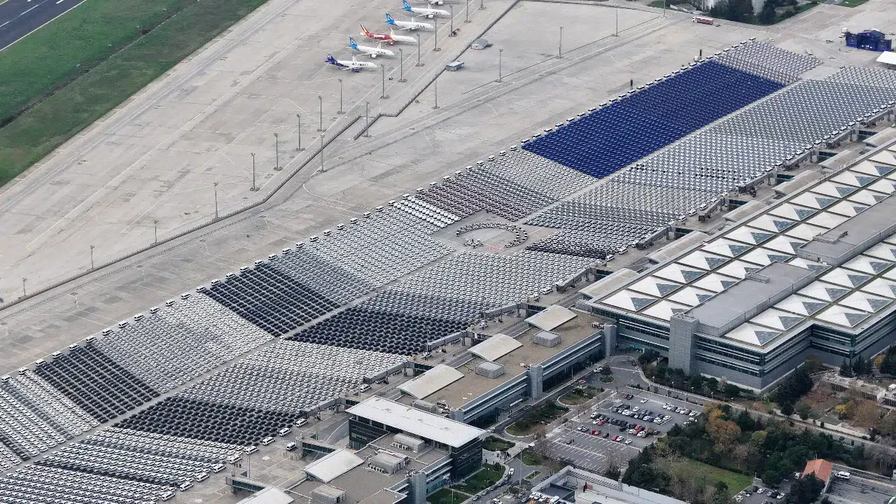 Simetrik şekilde aprona dizilen araçlar, dron ile görüntülendi.