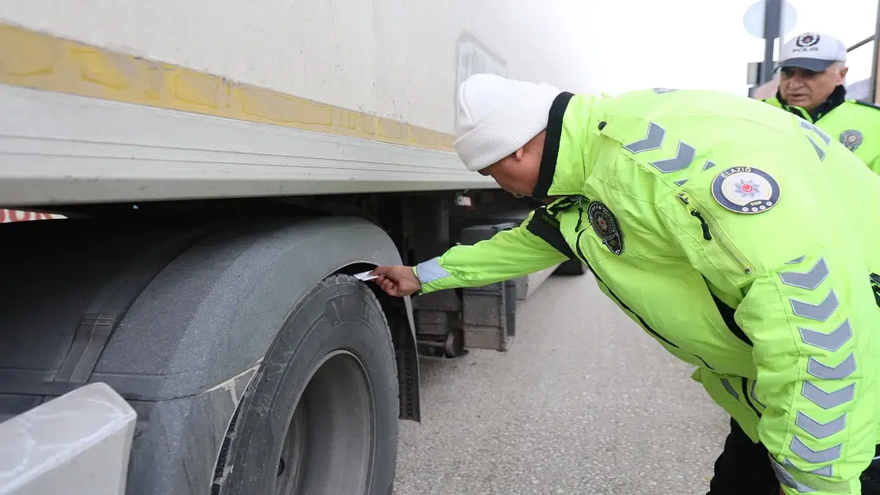 Ticari araçlar için kış lastiği takma zorunluluğu 15 Kasım itibarıyla ülke genelinde başladı. Elazığ İl Emniyet Müdürlüğü Bölge Trafik Denetleme Şube Müdürlüğü ekipleri de kış lastiği uygulaması denetimlerine başladı. Denetimlerde ekipler, tek tek lastikleri kontrol etti. Uygulamanın 15 Nisan 2026'ya kadar devam edeceğini aktaran ekipler, sürücülere bilgilendirici broşürler dağıttı. Kış lastiği takmayan sürücülere ise 5 bin 856 lira ceza kesildi.