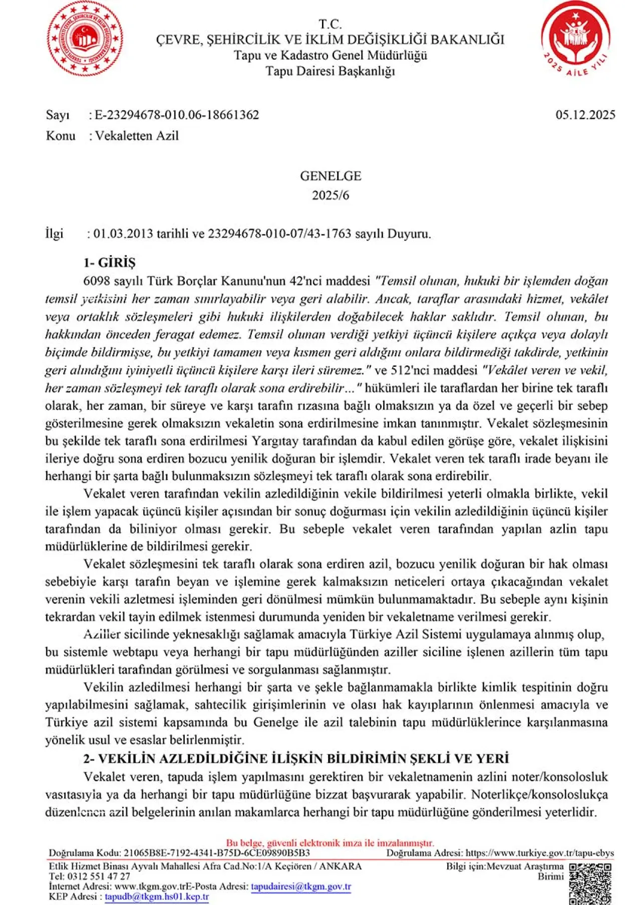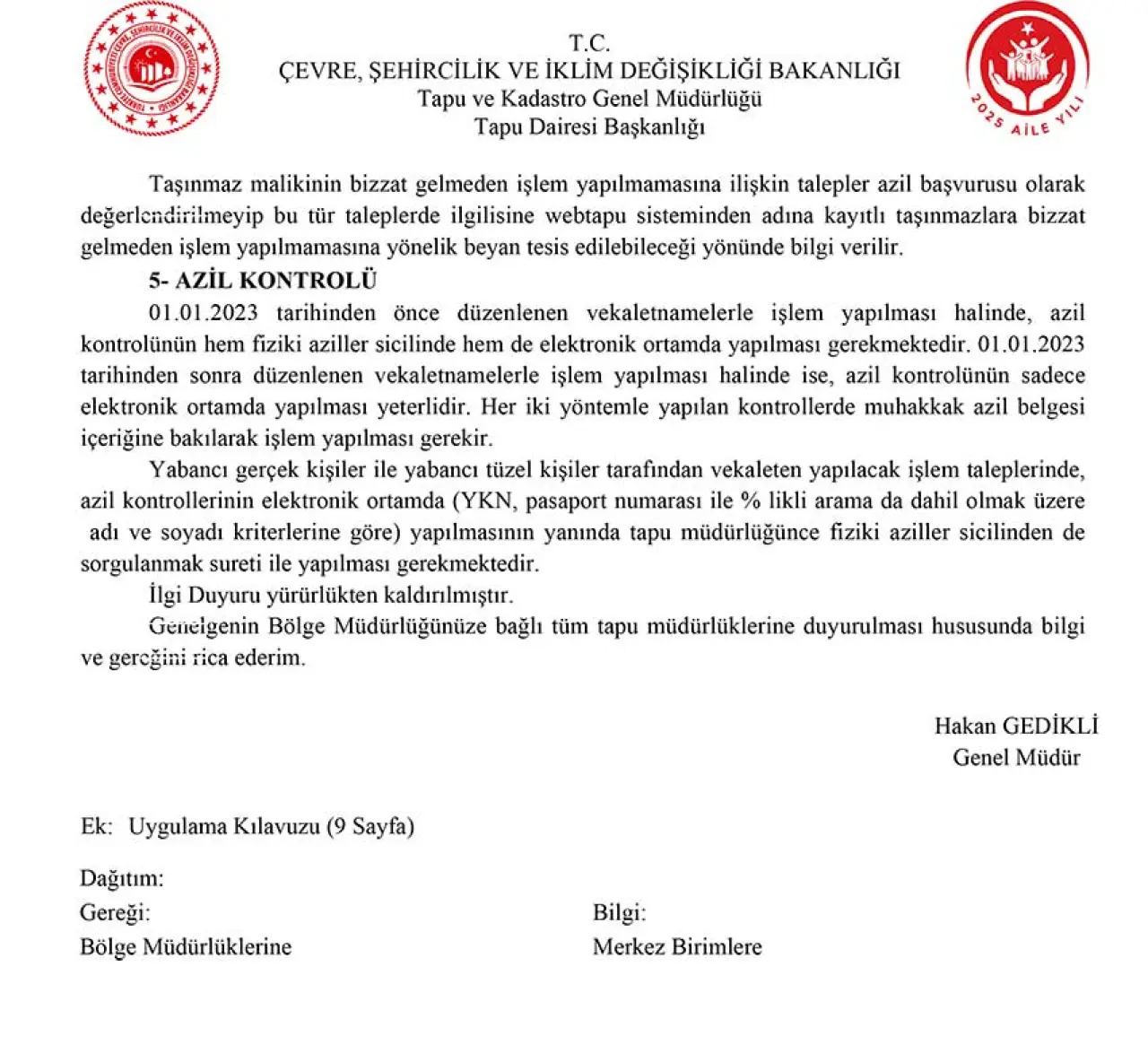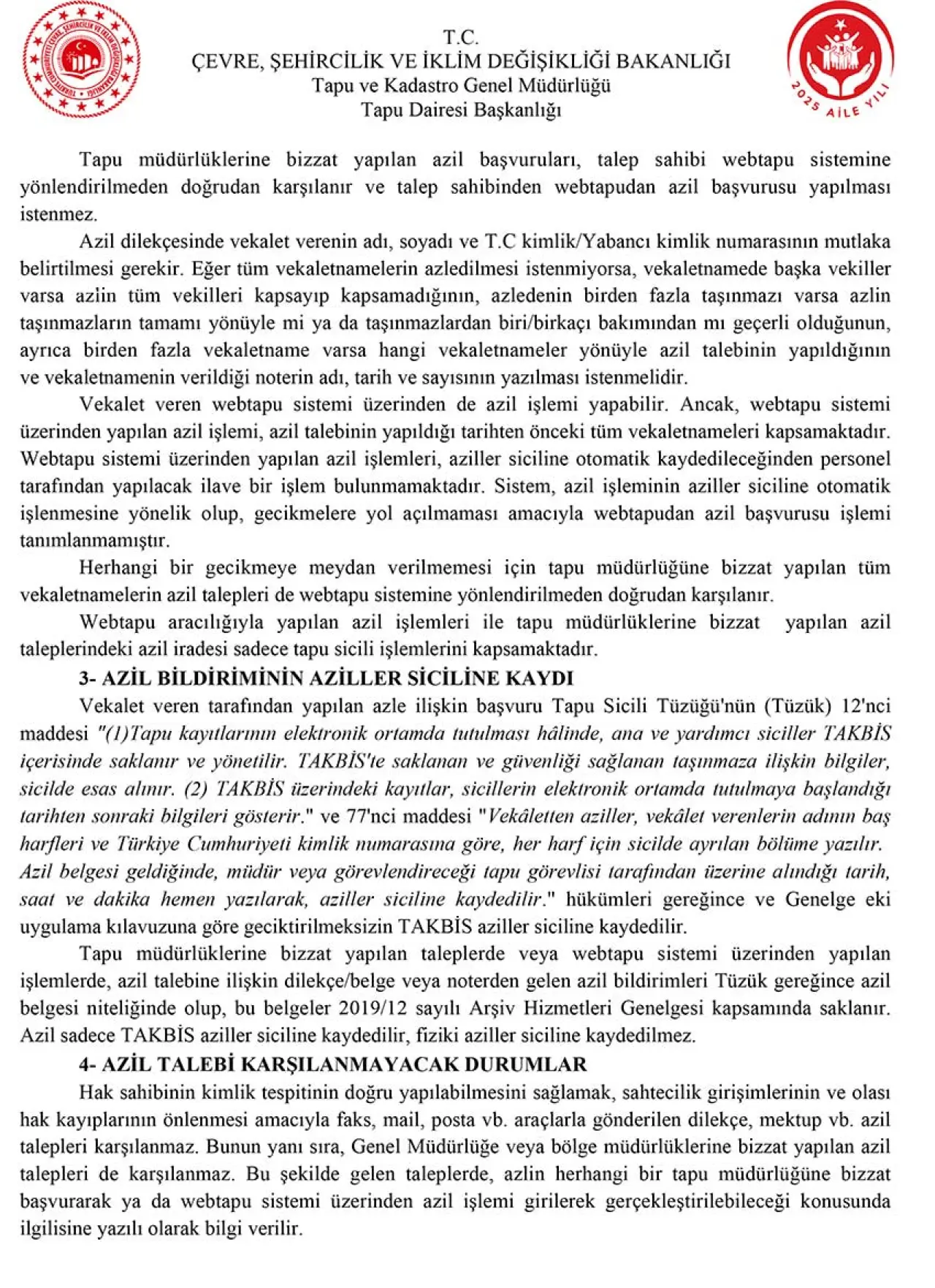1 Ocak 2023'ten önce verilen vekaletnamelerin tapu müdürlüklerine başvurarak, bu tarihten sonraki vekaletnamelerin ise müdürlüklerin yanı sıra webtapu üzerinden de iptal edilebileceği ifade edildi.