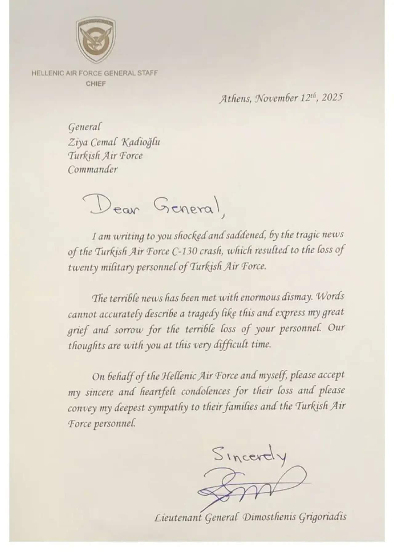Yoğun tepkiler üzerine bu paylaşımını dakikalar içinde silen Yunan Hava Kuvvetleri, komutanları Korgeneral Dimosthenis Grigoriadis tarafından gönderilen 12 Kasım tarihli taziye mesajını yine yayınladı.