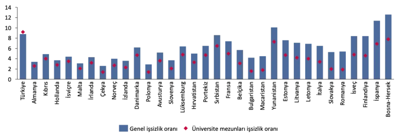 Almanya, İtalya, Polonya, Fransa, İspanya gibi ülkelerde süreç sağlıklı işliyor. Türkiye’de bu durum tersine dönerken üniversite mezunları, toplum ortalamasından daha yüksek oranda işsiz olarak ortaya çıkıyor.