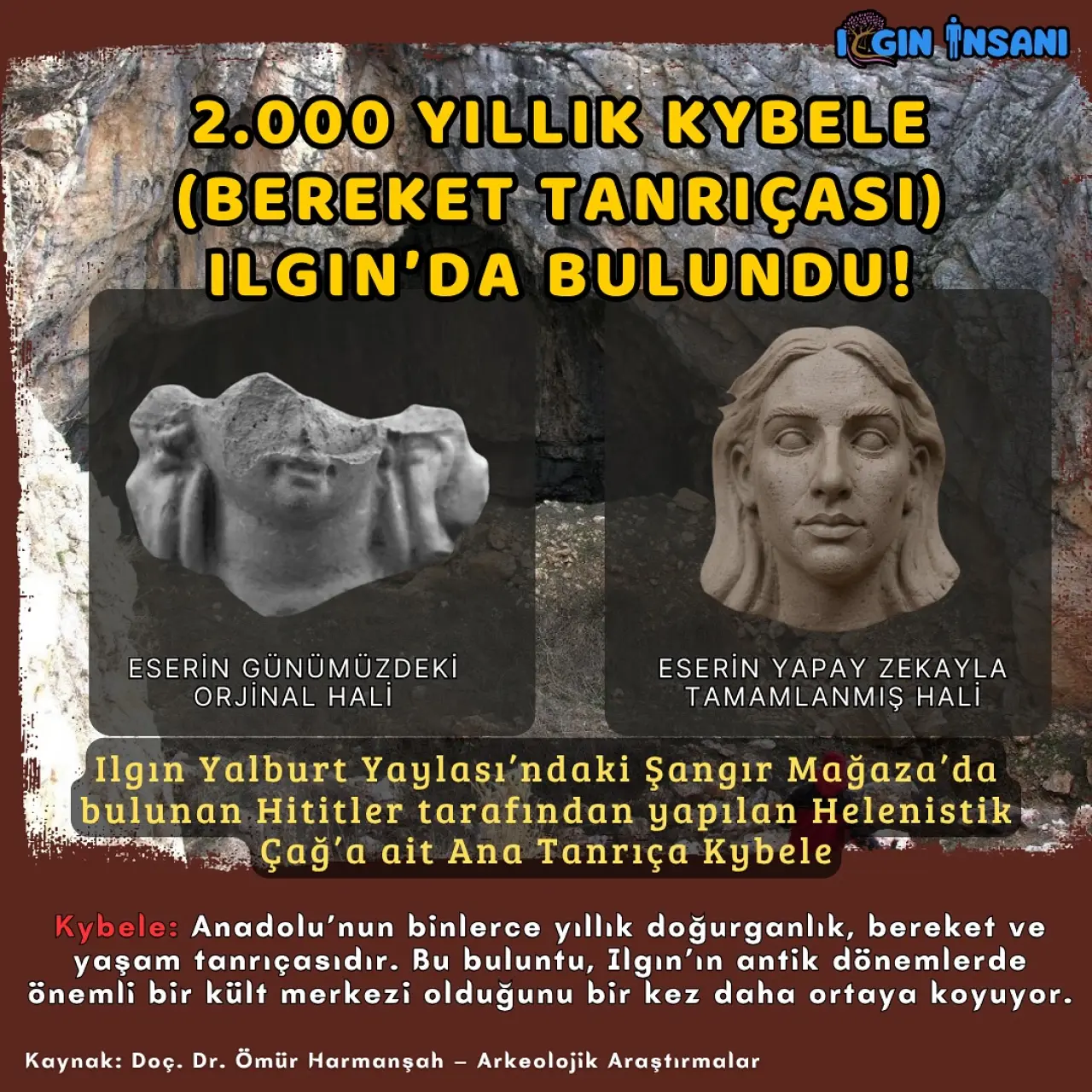 Doç. Dr. Ömür Harmanşah’ın 2010–2011 yıllarında yaptığı arkeolojik araştırmalarla buranın sıradan bir mağara olmadığını, Helenistik Çağ’da Hitit Kralı IV. Tuthaliya tarafından yapılan ve kullanılan kutsal bir tapınma alanı olduğunu ortaya çıkardı. Şangır Mağaza’daki çalışmalar sırasında mimari parçalar, ritüel izleri, çanak çömlekler ve tapınma objeleriyle birlikte Kybele’ye ait heykel parçası bulundu. Bu fotoğraflarda gördüğünüz eser, mağaradan çıkarılan orijinal parçanın ve yapay zekâ ile tamamlanmış temsili hali.