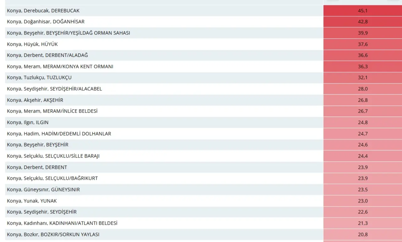 Yağışlı sistemin en fazla etkilediği bölgeler Konya’nın batı ve güneybatı kesimleri oldu. Derebucak: 45,1 kg/m², Doğanhisar: 42,8 kg/m², Beyşehir Yeşildağ Orman Sahası: 39,9 kg/m², Hüyük: 37,6 kg/m² ve Derbent Aladağ: 36,6 kg/m² yağış ile bu sistemin yıldızı oldular. Bu ilçelerde yağış miktarları, mevsim ortalamalarının üzerinde gerçekleşti.