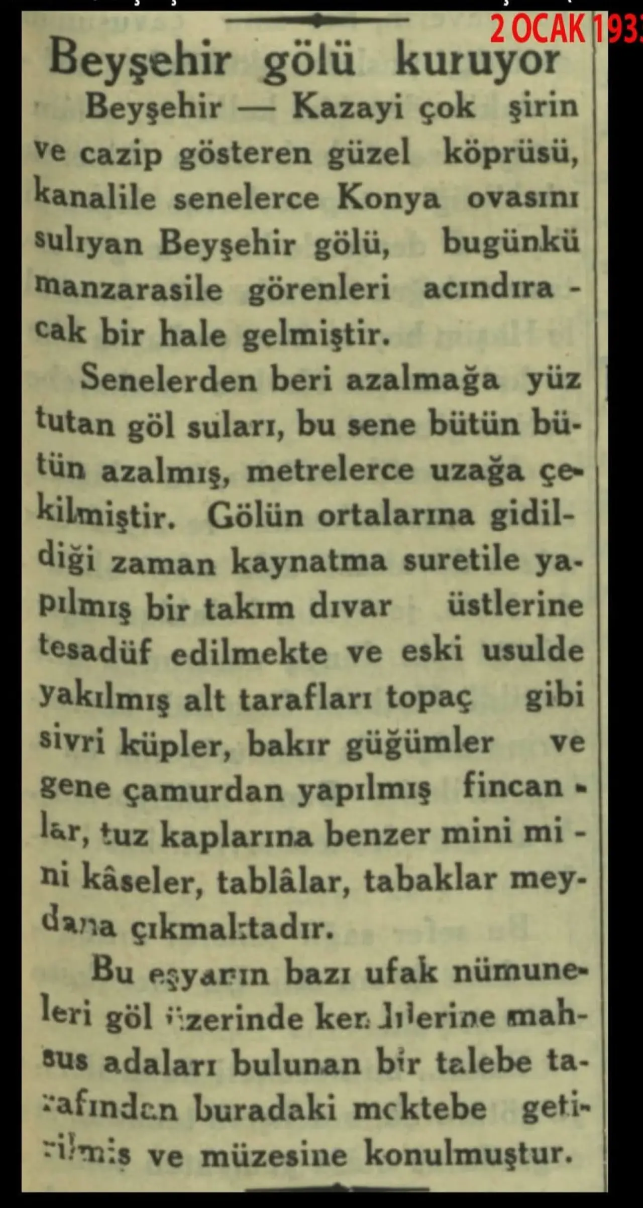 Senelerden beri azalmağa yüz tutan göl suları, bu sene bütün bütün azalmış, metrelerce uzağa çekilmiştir. Gölün ortalarına gidildiği zaman kaynatma suretile yapılmış bir takım divar üstlerine tesadüf edilmekte ve eski usulde yakılmış alt tarafları topaç gibi sivri küpler, bakır güğümler gene çamurdan yapılmış fincanlar, tuz kaplarına benzer mini mini kâseler, tablâlar, tabaklar meydana çıkmaktadır" yazısı yer almış. Beyşehir 1933'te yaşadığı kaderi 2025 yılında da yaşıyor.