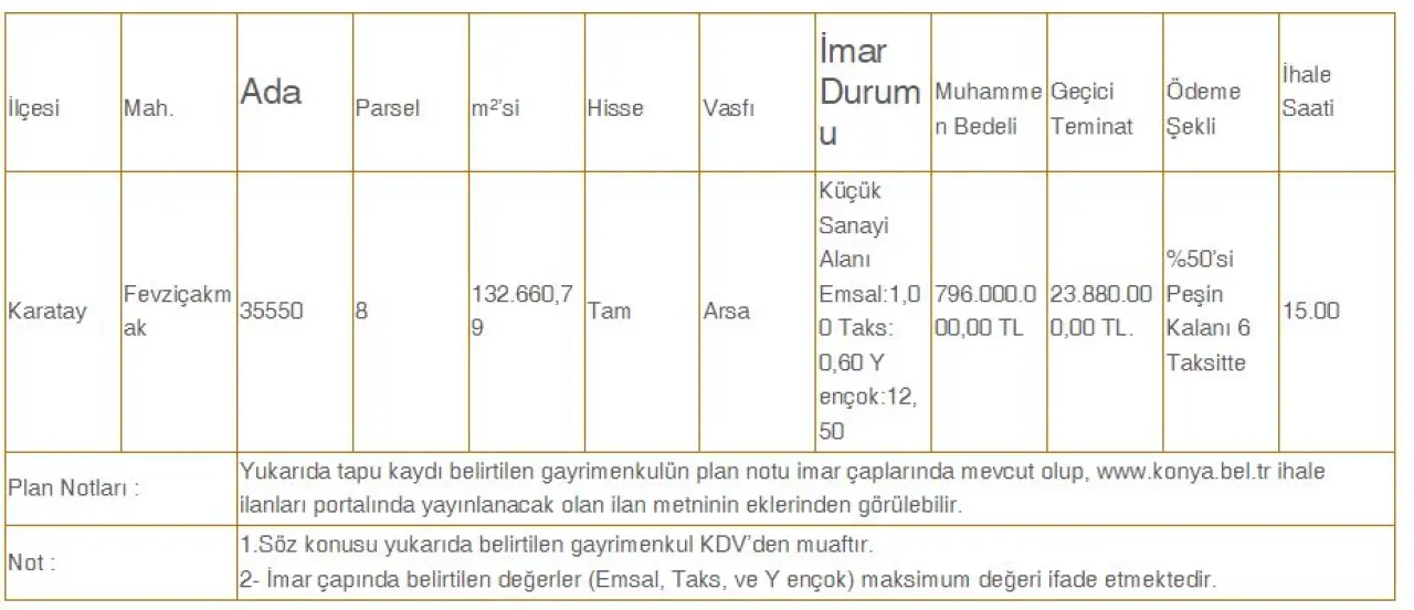 Konya Büyükşehir Belediyesi 132.660,79 m2 olan küçük sanayi arsasına 796 milyon TL muhammen bedel belirledi. Arsanın bulunduğu kısımda ise çok sayıda sanayi sitesi ve hızla yükselen konut projeleri bulunuyor.