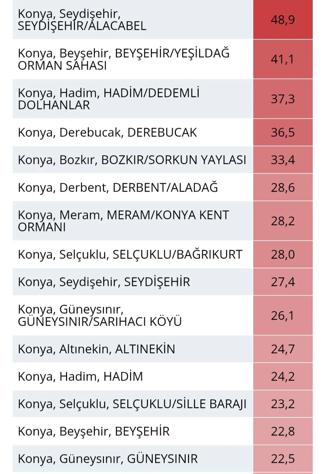 Konya’da yağışın en fazla görüldüğü ve metrekareye en çok yağışın düştüğü noktalar şu şekilde sıralandı: Seydişehir / Alacabel: 48,9 kg, Beyşehir / Yeşildağ Orman Sahası: 41,1 kg Hadim / Dedemli Dolhanlar: 37,3 kg, Derebucak: 36,5 kg ve Bozkır / Sorkun Yaylası: 33,4 kg