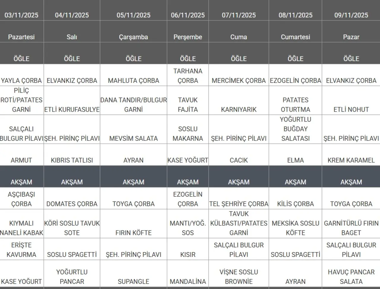 Konya Şehir Hastanesi’nde dana tandır, piliç roti, kıymalı naneli kabak, Meksika soslu köfte, Bolonez soslu makarna, fırın balık, Mengen oturtma, çardak kebabı, içli köfte, çoban kavurma, tavuk döner ve sac kavurma gibi menüler kasım ayının sofralarını süsleyecek.