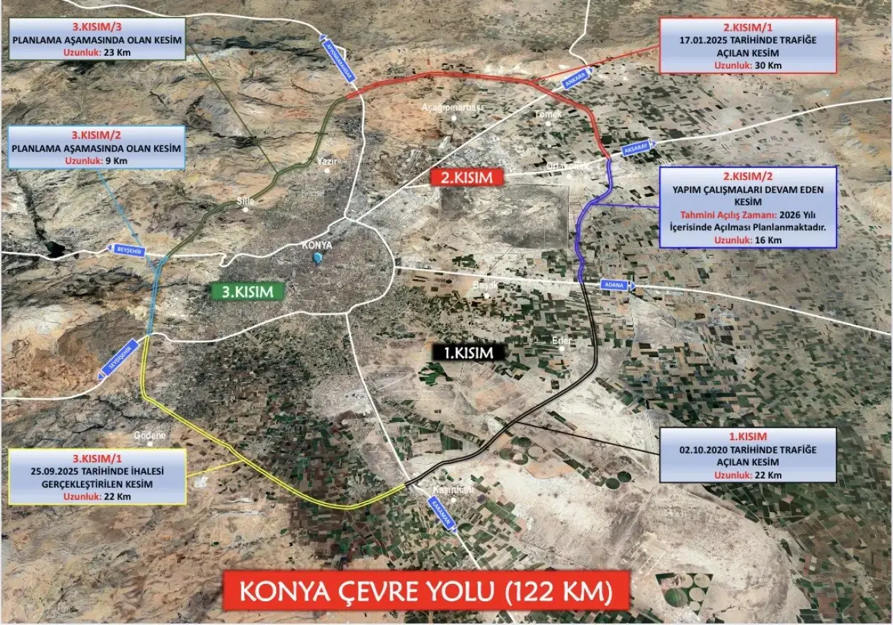 Konya Çevre Yolu Projesi için ilk adım 2011 yılında atıldı ve ihaleye çıkıldı. Yolun yapımına 2014’te başlandı. Projenin 1. etabı, yaklaşık 22 kilometrelik uzunluğa sahip. 2x3 şeritli, bitümlü sıcak karışım kaplamalı bölünmüş yol standardında inşa edilen etap, 2020 yılında trafiğe açılarak şehir içi ulaşımda önemli bir rahatlama sağladı.2025 yılı yatırım programına göre 3. etap için ayrılan bütçe 251 milyon TL olsa da, toplam maliyetin yıllar içinde katlanarak artması öngörülüyor. Geçen yıl 3,6 milyar lira olan toplam proje maliyetinin bu yıl 4,7 milyar liraya yükselmesi, çevre yolu yatırımında karşılaşılan ekonomik baskıyı da gözler önüne seriyor. Projenin son ayağını oluşturan ve en zorlu bölüm olarak değerlendirilen 54 kilometrelik 3. etabın ise 2028 yılında tamamlanarak trafiğe açılması hedefleniyor.