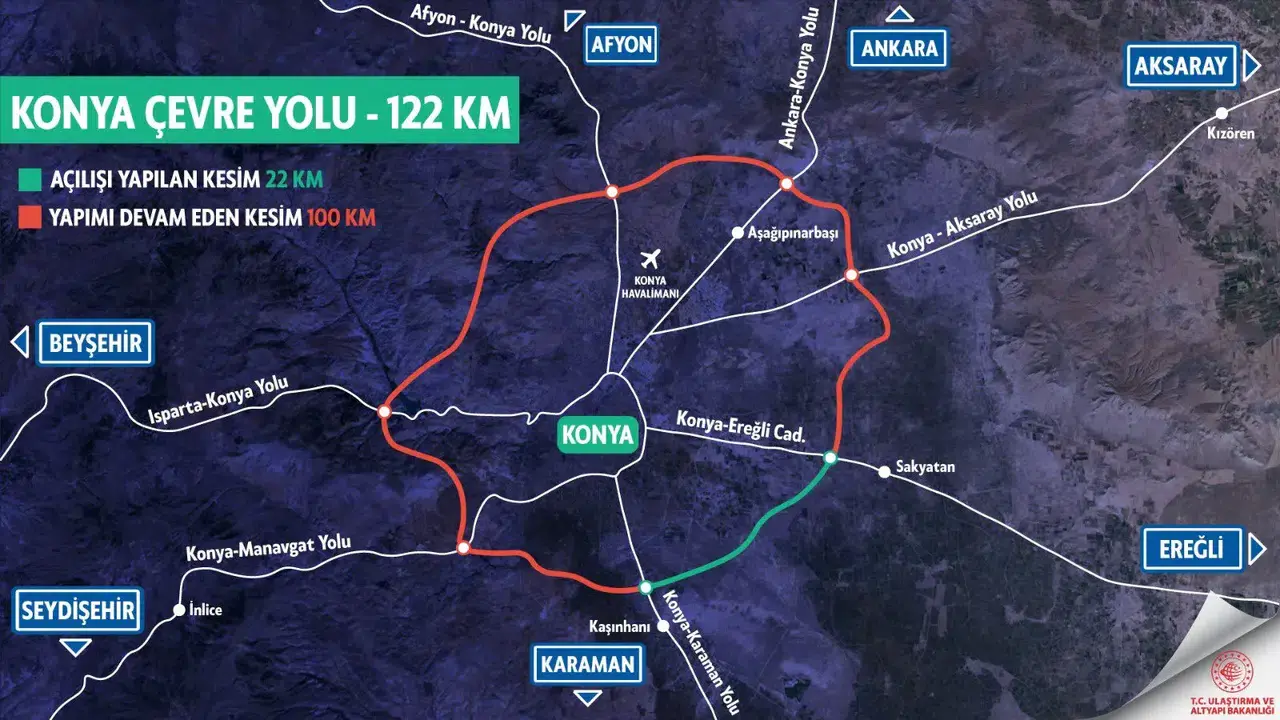 Yapımı tamamlandığında 122 km uzunluğa ulaşacak olan yol, 3 gidiş–3 geliş 6 şeritli yapısıyla Konya’nın büyüyen ulaşım ihtiyacına güçlü bir çözüm sunacak. Çevre Yolunda 22 kilometrelik ilk kesim 2020 yılında tamamlanarak trafiğe açıldı. Afyonkarahisar–Aksaray yönündeki 30 kilometrelik kesim hizmet verirken Aksaray–Adana yönündeki 16 kilometrelik bölümde çalışmalar devam ediyor. Konya Çevre Yolu, tarım, turizm, ticaret ve sanayide artan hareketliliğe kesintisiz ulaşım desteği sağlıyor.