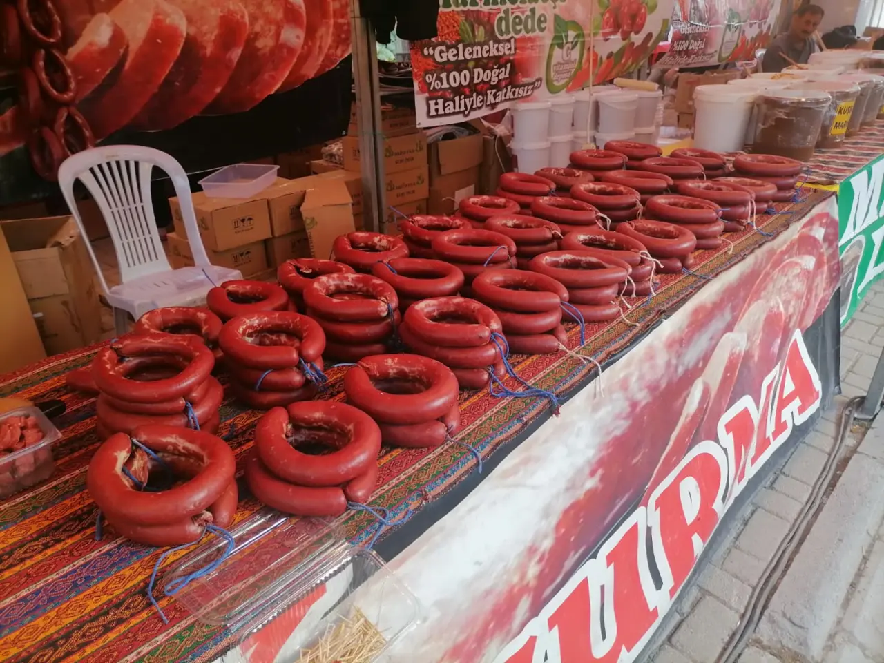 Normalde kangalını 400 TL'ye sattığını belirten esnaf, Erzurumlular Yöresel Ürünler Günü'ne özel Erzurum Kasap sucuğunun 3 kangalını 700 TL'ye sattığını söyledi. 3 kangal sucuğun ağırlığı ise ortalama 1 buçuk kiloya yaklaşırken festivaldeki stant ilgi odağı oldu.