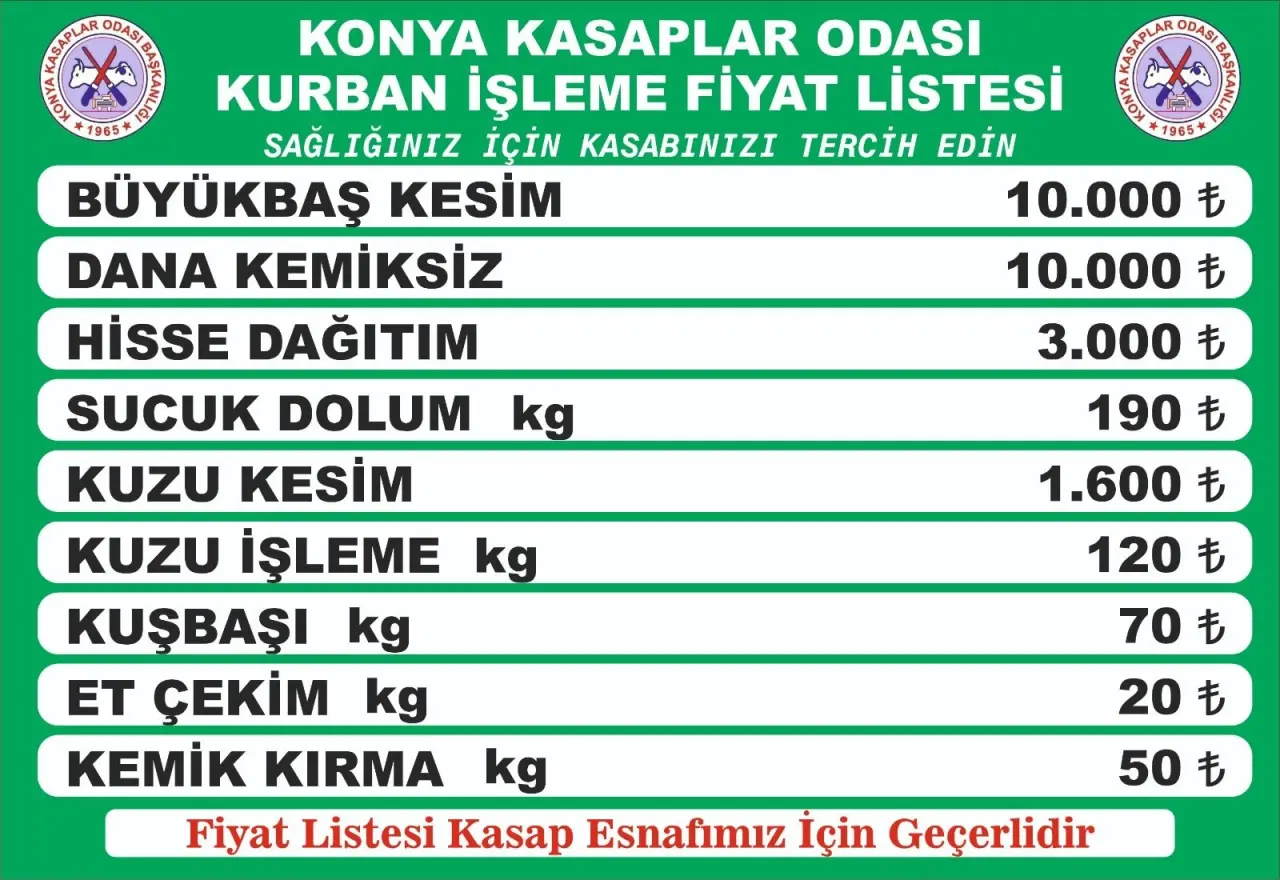 Konya Kasaplar Odası bu yıl ki kurban kesim fiyatlarını açıkladı. Kasapların alacağı ücretler belli olurken büyükbaş hayvan kesim fiyatı 10 bin TL olarak belirlendi. Hayatın her alanında olduğu gibi işçilik ücretlerinde de ciddi artışlar yaşanırken kasaplar da “harman” vakti olarak gördükleri kurban bayramında alın terlerinin ve ustalıklarının karşılığını almak için sahada olacak. “Sağlığınız için kasabınızı tercih edin” sloganını kullanan Konya Kasaplar Odası bu yılki kurban kesim, söküm, parçalama ve kıyma çekim fiyatlarını belirledi.