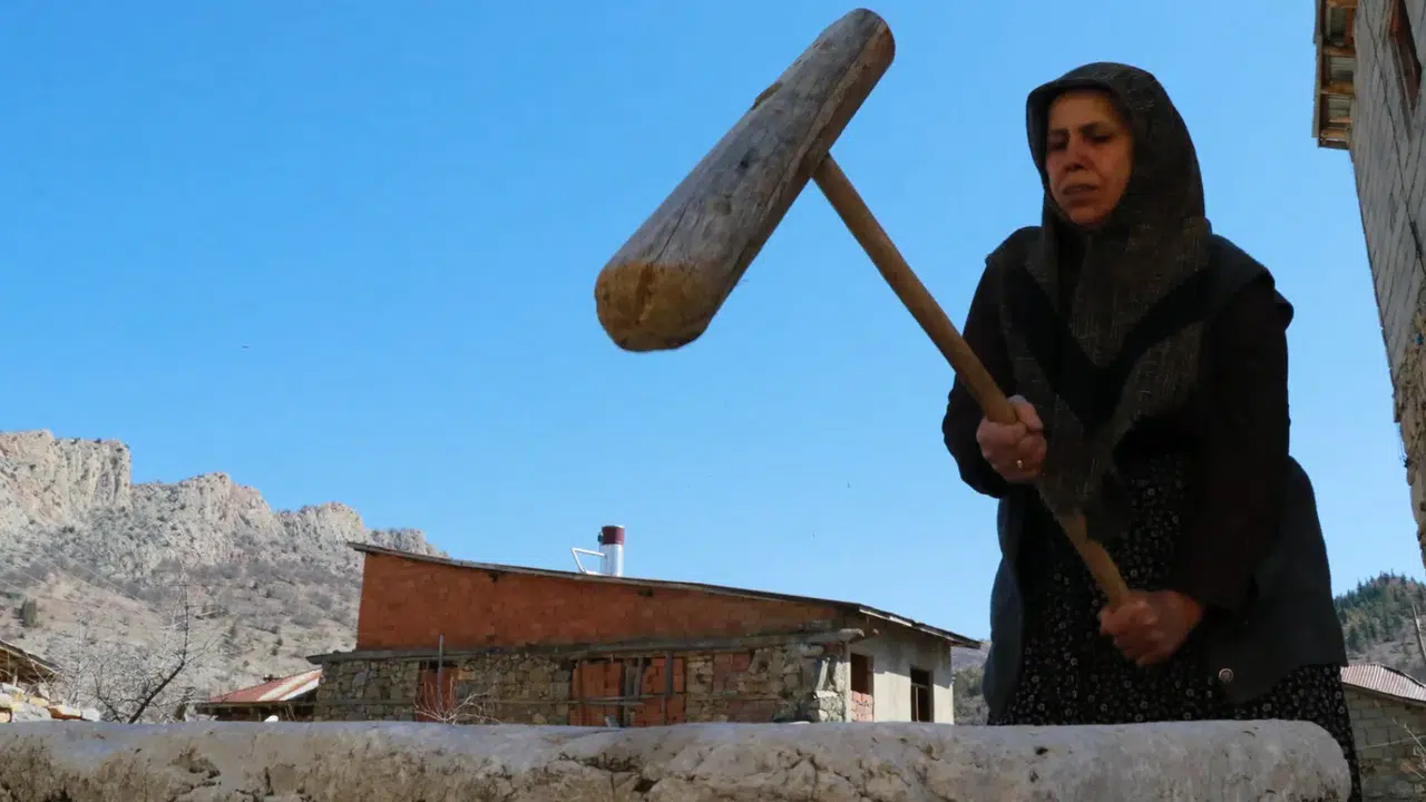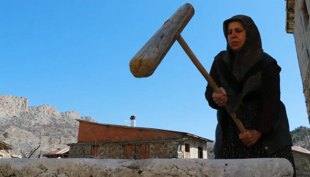 Teknolojik gelişmelere rağmen geleneksel yöntemleri terk etmediklerini dile getiren Sevinç, "Bu dibek varken mutfak robotuna gerek kalmıyor. Elimizin emeği, alnımızın teriyle tokmakla dövüyoruz. Atalarımız bize böyle bırakmış, biz de koruyoruz. Ben 45 senedir burada kullanıyorum" ifadelerini kullandı.