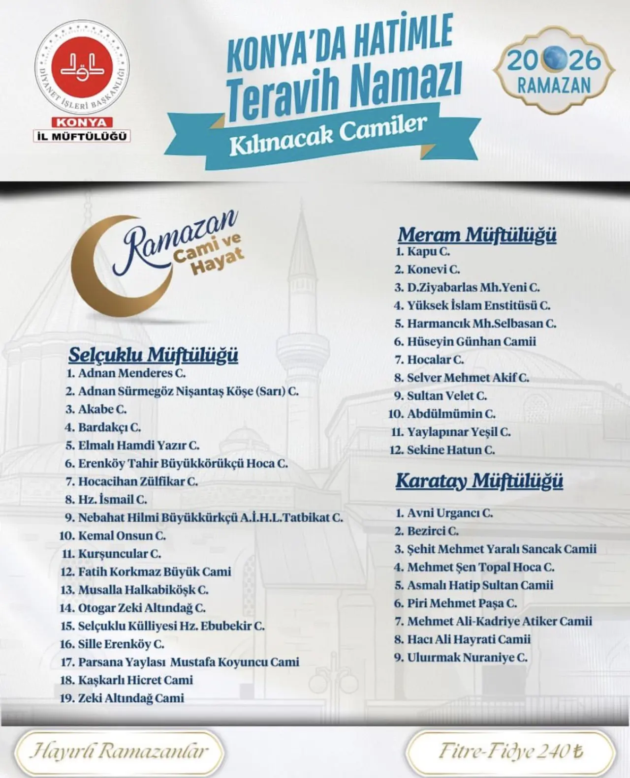 İslam coğrafyasının lideri Türkiye, on bir ayın sultanı Ramazan-ı Şerif’i bu akşam kılınacak teravih namazı ile karşılayacak. Ülke genelinde Ramazan ayı için son hazırlıklar tamamlanırken camiler de bu kutlu aya özel hazırlandı. Konya da Ramazan ayını en güzel şekilde idrak edecek iller arasında olacak. İl merkezinde 40 ayrı camide teravih namazları hatimle kıldırılacak. Camilerde hem kadınlar için hem de erkekler için mukabele programları düzenlenirken bazı camilerde hayırseverler tarafından er akşam iftar verilecek.