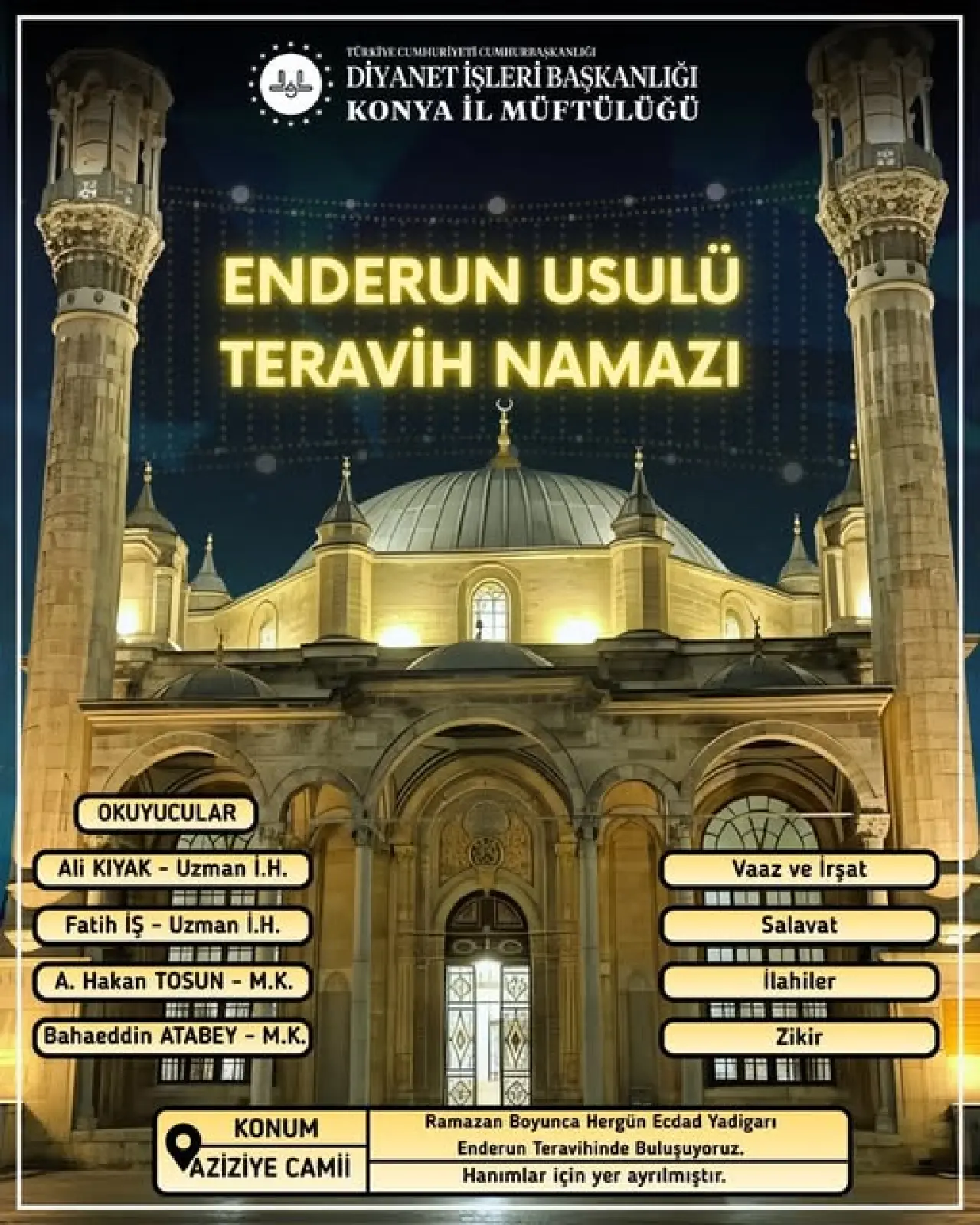 Konya’nın tarihi camisi Aziziye’de ise bu sene Enderun usulü teravih namazı kılınacak. Osmanlı yadigarı bu camide teravih namazını müezzinler Türk musikisinin farklı makamlarındaki ilahilerle süsleyecek. 1831 yılından bu yana süre gelen Enderun Usulü Teravih’in özelliği, namazın her 4 rekatının, Türk musikisinin farklı makamlarında kılınması ve bu makamlardaki ilahilerle de süslenmesi. Makamları klasik Türk musikisinin en önemli ismi olan Itri'ye dayanan Enderun usulü teravihte en çok "Hicaz", "Segâh", "İsfahan", "Uşşak" ve "Acemaşiran" makamları kullanılırken, vitir namazı "Segâh" makamında kılınıyor.