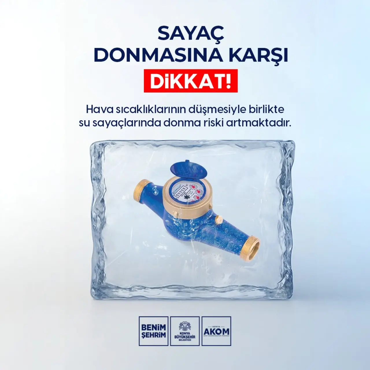 Konya AKOM'dan yapılan açıklamada, "Hava sıcaklıklarının düşmesiyle birlikte su sayaçlarında donma riski artmaktadır. Donma nedeniyle sayaç ve tesisatlarda ciddi hasarlar oluşabilir. Açıkta bulunan sayaçlar mutlaka uygun yalıtım malzemeleriyle korunmalıdır. Sayaçların bulunduğu alanlar soğuk hava girişine karşı kapatılmalıdır. Uzun süre kullanılmayan yapılarda tesisattaki su boşaltılmalıdır. Donmuş sayaçlara ateş veya kaynar su ile müdahale edilmemelidir. Alınacak basit önlemlerle su kaybı ve maddi zararların önüne geçilebilir" ifadelerine yer verildi.