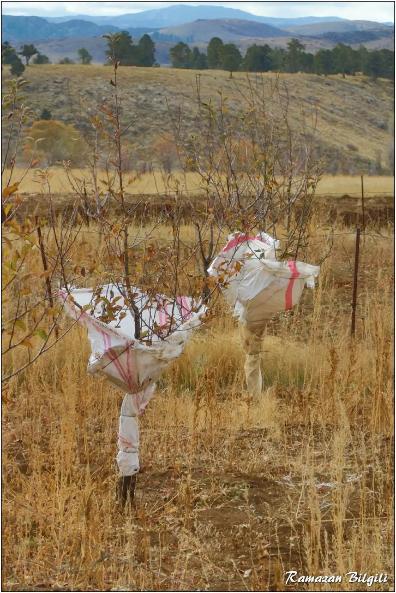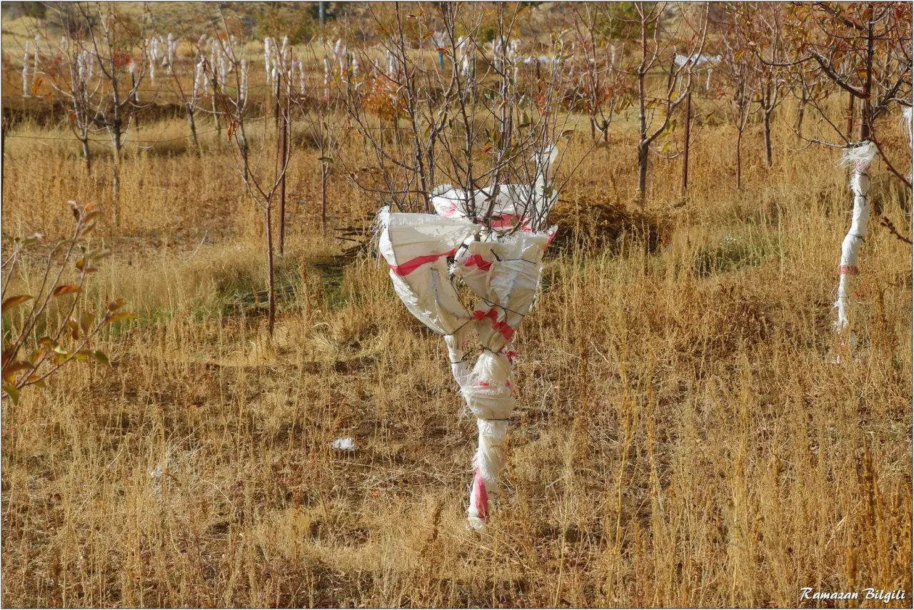 Konya’da üreticiler soğuk kış günlerinde meyve ağaçlarının dondan ve kemirgenlerden zarar görmemesi için ilginç bir yola başvurdu. Hadim ve çevresindeki üreticiler; kiraz, ceviz, badem gibi ağaçların genç fidanlarını kış şartlarına hazırlamak için önemli bir koruma çalışması yapıyor. Soğuk hava ve kemirgenlerin verebileceği zararlara karşı fidanların gövdeleri çuvalla sarılarak güvence altına alındı.