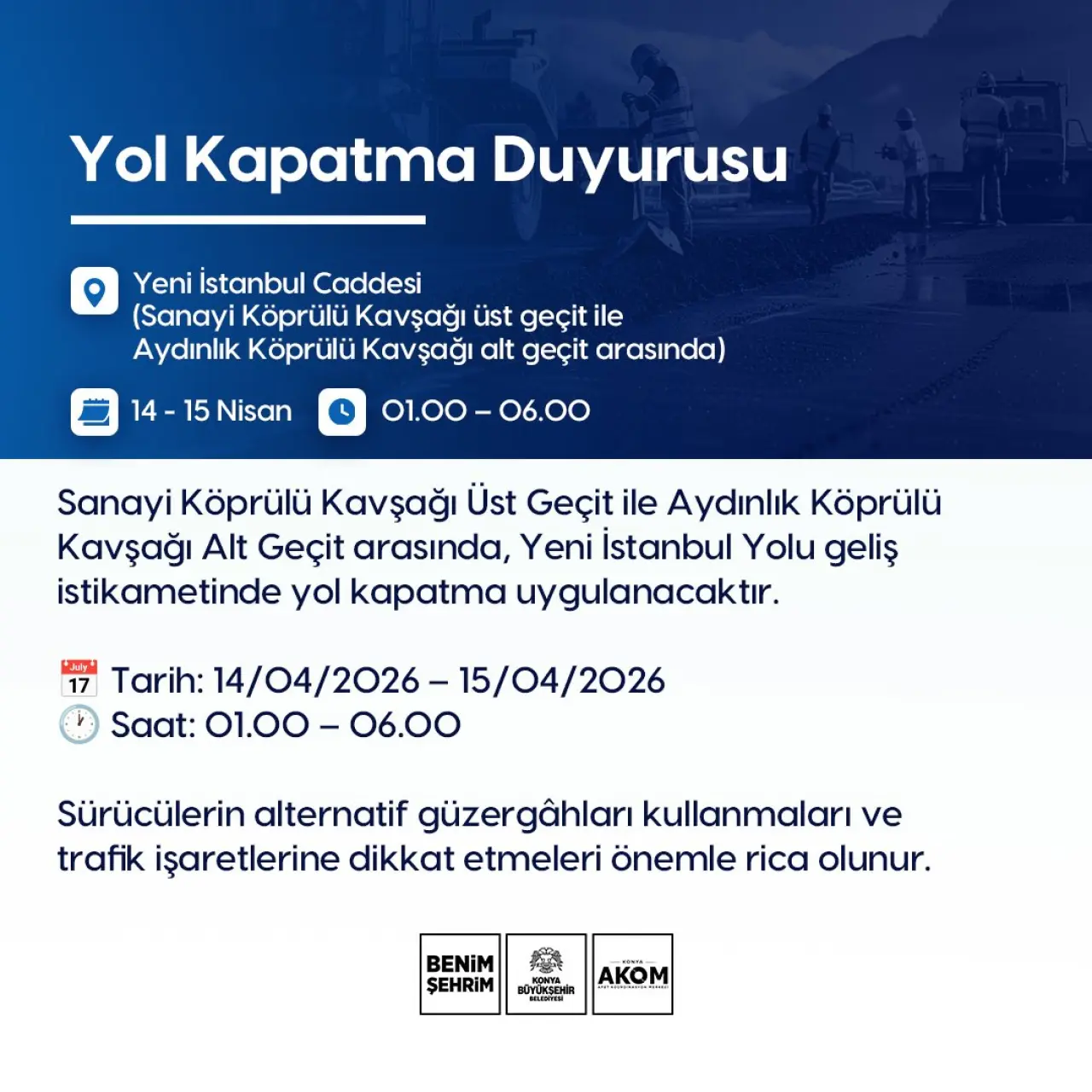 Konya'nın Selçuklu ilçesinde bulunan ve günün her saatinde yoğun olma özelliği taşıyan köprülü kavşak ve alt geçit arasında bulunan yol ulaşıma kapatılacak. Konya AKOM'dan yapılan açıklamada, “14/04/2026 - 15/04/2026 tarihlerinde saat 01.00 – 06.00Sanayi Köprülü Kavşağı Üst Geçit ile Aydınlık Köprülü Kavşağı Alt Geçit arasında, Yeni İstanbul Yolu geliş istikametinde yol kapatma uygulanacaktır. Sürücülerin alternatif güzergâhları kullanmaları ve trafik işaretlerine dikkat etmeleri önemle rica olunur” ifadelerine yer verildi.