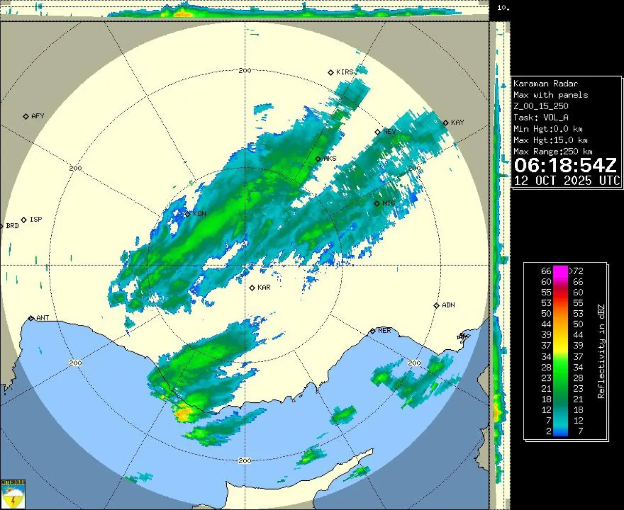 Seydişehir 10.2 mm, Meram Güneydere Köyü 9.1 mm, Karatay Göçü Köyü Bozdağ Milli Parkı 8 mm, Meram İlice Beldesi 8 mm, Akören 8 mm, Konya Bölge 7.2 mm, Emirgazi 6.5 mm, Karatay Bahri Dağdaş 6.3 mm, Altınekin 5.9 mm, Bozkır Sorkun Yaylası 5.8 mm, Karatay Esentepe Köyü 5.8 mm, Ahırlı 5.7 mm, Yalıhüyük 5.4 mm, Çumra 4.8 mm, Meram Konya Kent Ormanı 4.6 mm, Bozkır 4.3 mm, Yunak 4.2 mm, Çeltik 4.2 mm, Bozkır Sarıoğlan Beldesi 4,2 mm, Derebucak 4 mm, Halkapınar İvriz 3.8 mm, Kadınhanı 3.7 mm, Hadim Dedemli Dolhanlar 3.4 mm, Seydişehir Alacabel 2.8 mm, Akşehir 2.8 mm, Derbent Aladağ 2.6 mm, Karapınar Sazlıpınar Köyü 2.6 mm, Beyşehir 2.4 mm, Güneysınır 2.1 mm, Derbent 2.1 mm, Hadim 1.8 mm, Tuzlukçu 1.8 mm, Kadınhanı Altınova TİGEM 1.4 mm, Sarayönü 1.3 mm, Cihanbeyli Turanlar Köyü 1.2 mm, Ilgın 1.2 mm, Ereğli 1.2 mm, Kadınhanı Atlantı Beldesi 1.1 mm, Cihanbeyli Yeniceoba Beldesi 0.9 mm, Karapınar 0.9 mm, Taşkent 0.7 mm, Taşkent Balcılar 0.7 mm, Beyşehir Yeşildağ Ormanı 0.6 mm, Sarayönü Gözlü TİGEM 0.4 mm, Doğanhisar 0.3 mm yağış aldı.