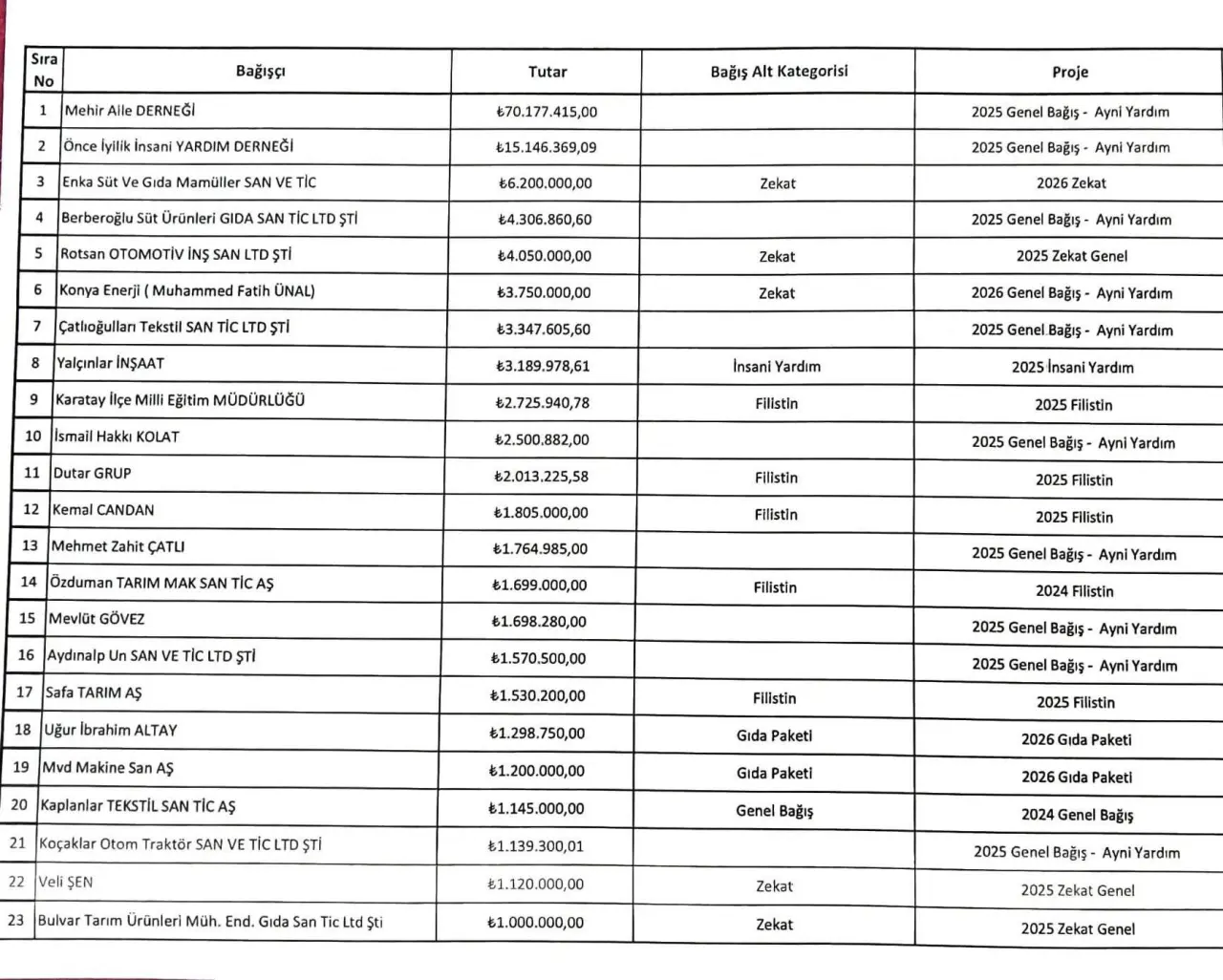 Konya’da tam 30 yıldır hayırseverlerin katkısıyla gençlerin yuvasını kuran Mehir Vakfı, Diyanet Vakfı Konya Şubesi’ne en fazla destek olan kurum oldu. 2025 yılında vakfa 70 milyonun üzerinde destek sağlayan Mehir Vakfı, genel bağış ve ayni yardım katkılarıyla listenin zirvesinde yer aldı. Önce İyilik İnsani Yardım Derneği 15 milyon liralık desteği ile adından söz ettirirken listenin üçüncü sırasında 6 milyon 200 bin lira ile Enka Süt yer aldı. Berberoğlu Süt 4,3 milyon lira, Rotsan Otomotiv 4 milyon lira, Konya Enerji 3,7 milyon lira, Çatlıoğulları Tekstil 3,3 milyon lira, Yalçınlar İnşaat 3.1 milyon lira, Karatay İlçe Milli Eğitim Müdürlüğü 2,7 milyon lira ve İsmail Hakkı Kolat 2,5 milyon lira ile listenin ilk 10’unu oluşturdu.