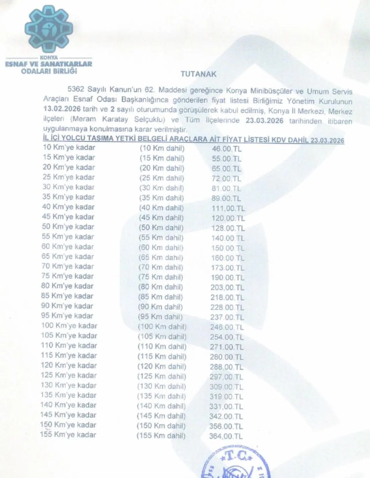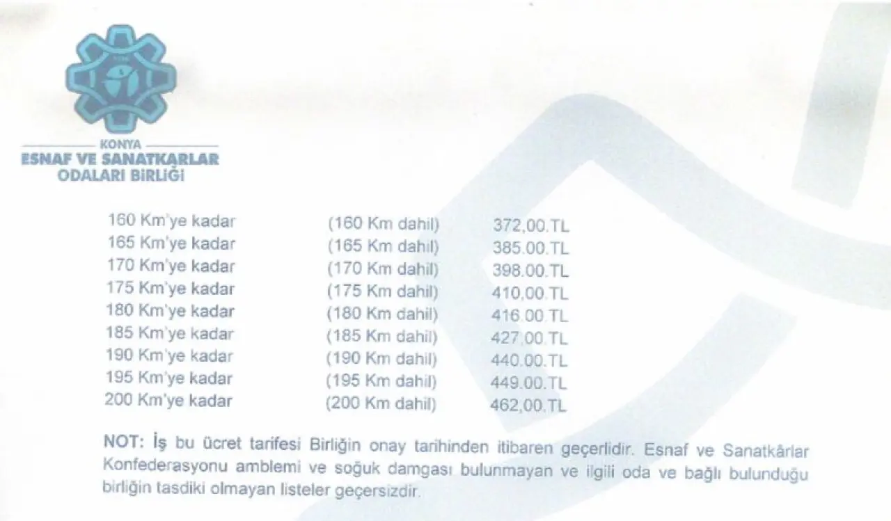 mesafeye göre fiyat listesi