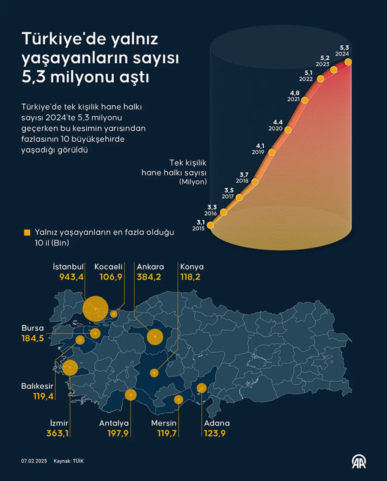 Yalnız yaşayanların sayısı, 2022'de 285 bin 731 artışla 5 milyon 67 bin 331'e, 2023'te 125 bin 494 artışla 5 milyon 192 bin 825'e ulaştı.