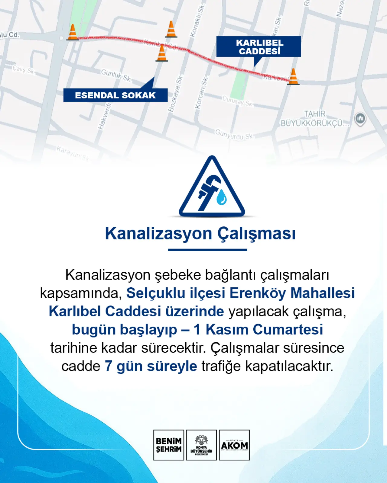 Konya AKOM'dan yapılan açıklamada, “Kanalizasyon şebeke bağlantı çalışmaları kapsamında, Selçuklu İlçesi Erenköy Mahallesi Karlıbel Caddesi üzerinde çalışma yapılacaktır. Çalışmalar nedeniyle, bugün itibarıyla başlayacak olup 01 Kasım Cumartesi tarihine kadar Karlıbel Caddesi’nin Rivayet Sokak ile Yeni Sille Caddesi arasında kalan kısmı 7 gün süreyle araç trafiğine kapalı olacaktır.