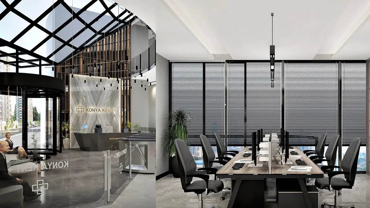 Kentplus’ın iç mimarisi; yüksek tavanlı ofis alanları, doğal malzeme dokuları, profesyonel karşılama bölümü ve bina kimliğine özel tasarlanan duyusal atmosferiyle premium bir çalışma deneyimi sunuyor. Ofisler 120 metrekareden 1200 metrekareye kadar isteğe göre şekillendirilebilir esneklikte. Elektrikli araç şarj istasyonu, fiber internet, üç toplantı salonu ve profesyonel bina yönetimi gibi ayrıcalıklar, kullanıcılarına modern bir iş yaşamını kesintisiz sunuyor.