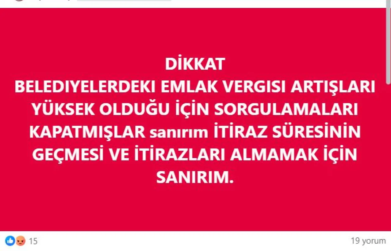 Konya sayfasında paylaşım yapan bir vatandaşın gönderisinde ise, "Belediyelerdeki Emlak Vergisi artışları yüksek olduğu için sorgulamaları kapatmışlar sanırım itiraz süresinin geçmesi ve itirazları almamak için sanırım" ifadeleri yer aldı. Bir diğer vatandaş ise, "Senelik 800 TL iken 5500 TL olmuş hayırdır ne oluyor nasıl bir düzen içindeyiz" paylaşımı yaparak duruma tepki gösterdi.
