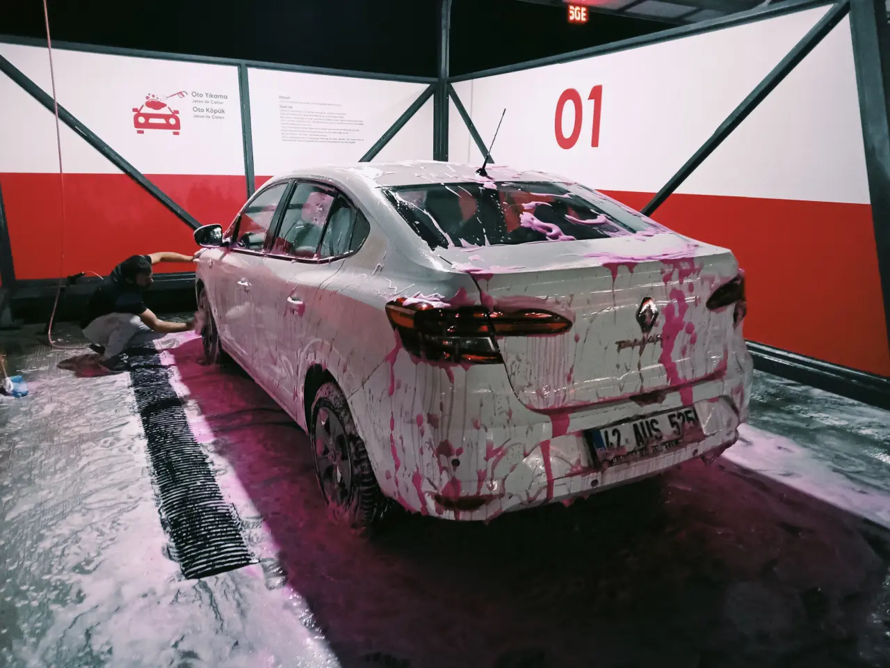 Self servis olarak oto yıkama bölümünde onlarca araç kuyruk oluşturuyor. Beyaz sabun yerine pembe sabun kullanan petrol resmen fenomen haline geldi.