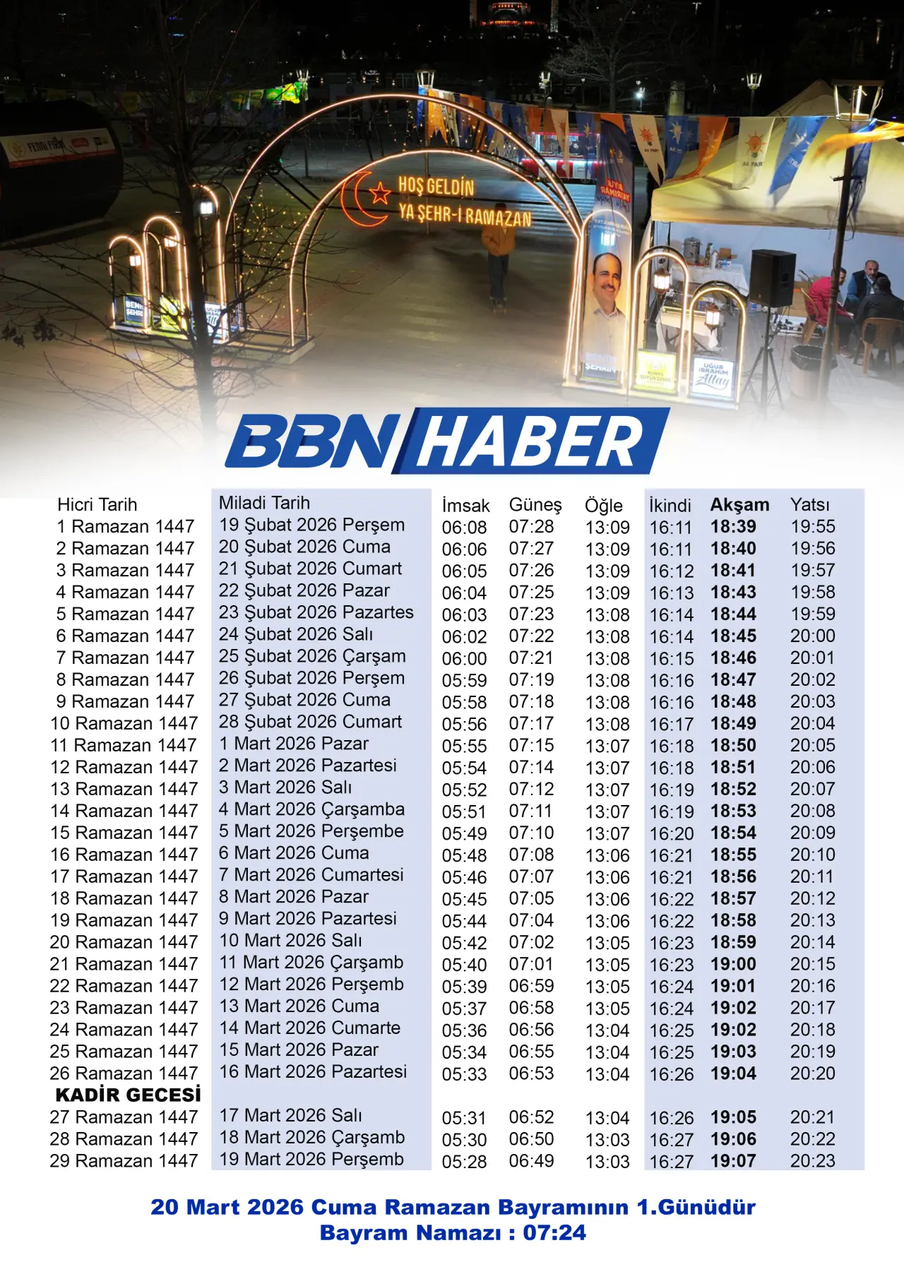 İŞTE KONYA’NIN 2026 RAMAZAN İMSAKİYESİ