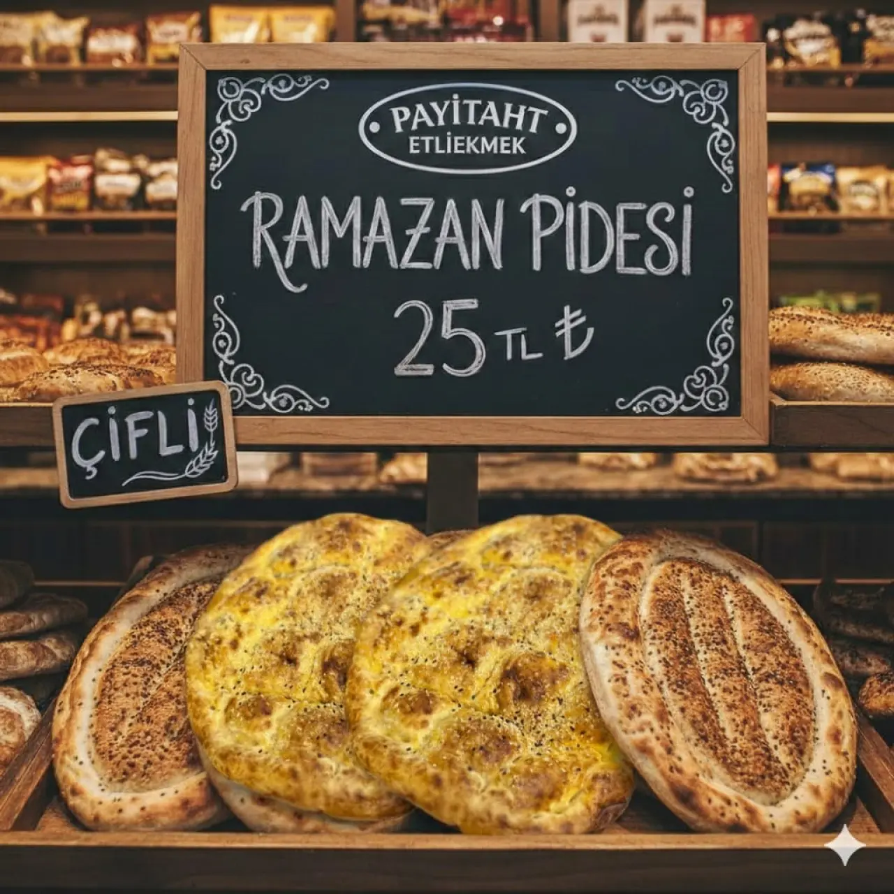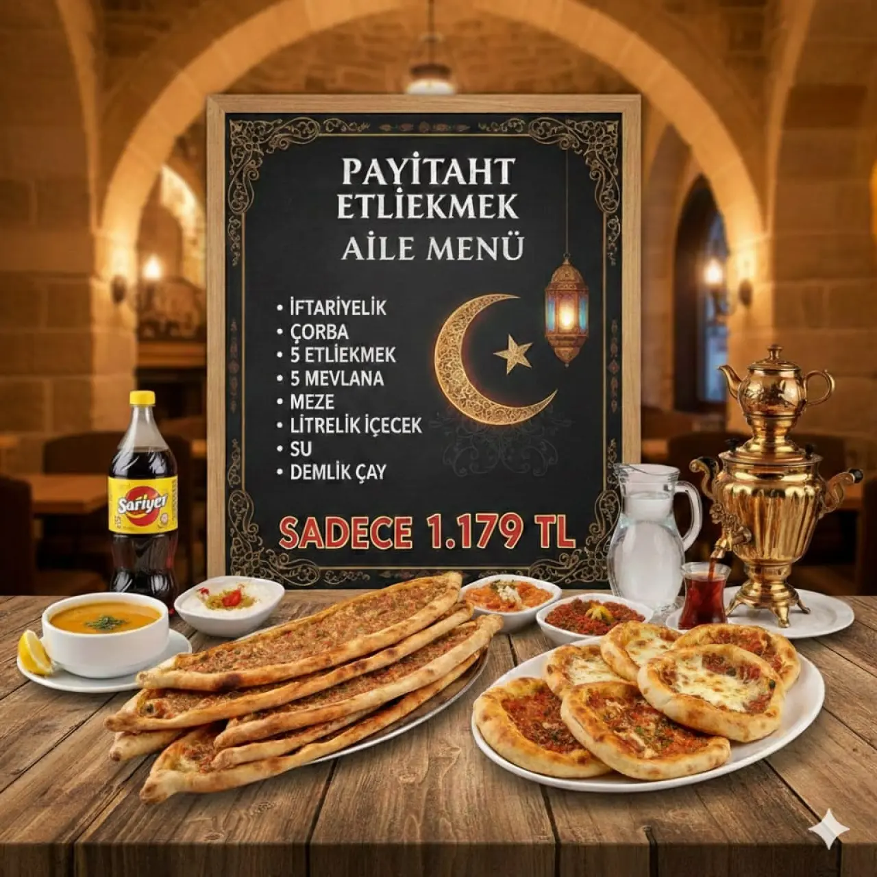 Payitaht Etliekmek’te iftar menüsü belli oldu. Çorba – Etliekmek veya Konya Böreği – Tatlı – İftariyelik 300 TL ve Aile menüsünde ise çorba – 5 Konya Böreği ve 5 Etliekmek – tatlı – litrelik içecek – iftariyelik 1179 TL menüler var. 10’lu paketler ve litrelik içecek toplamda 1100 TL’den satılıyor. 20’li Etliekmek menüsü ve litrelik içecek ile birlikte 2 bin TL’ye satılıyor. Çiftli Yumurtalı Ramazan Pidesi 25 TL’den satılıyor.