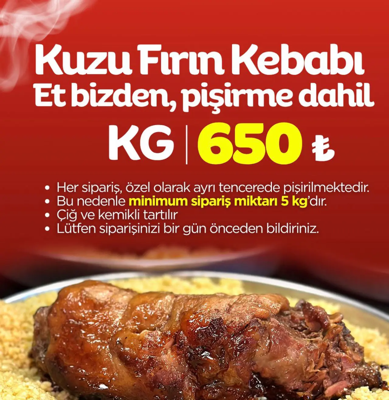 Enflasyona savaş açtık. Çoğu yerde Fırın Kebabı 500 ila 800 TL arasında olurken biz sadece 380 TL'ye porsiyon kebap veriyoruz. Lezzetimizi tatmak isteyen tüm vatandaşlarımızı Fevziçakmak Mahallesi Şehit Hamdi Karagöz Caddesi'nde bulunan şubemize davet ediyoruz" dedi.