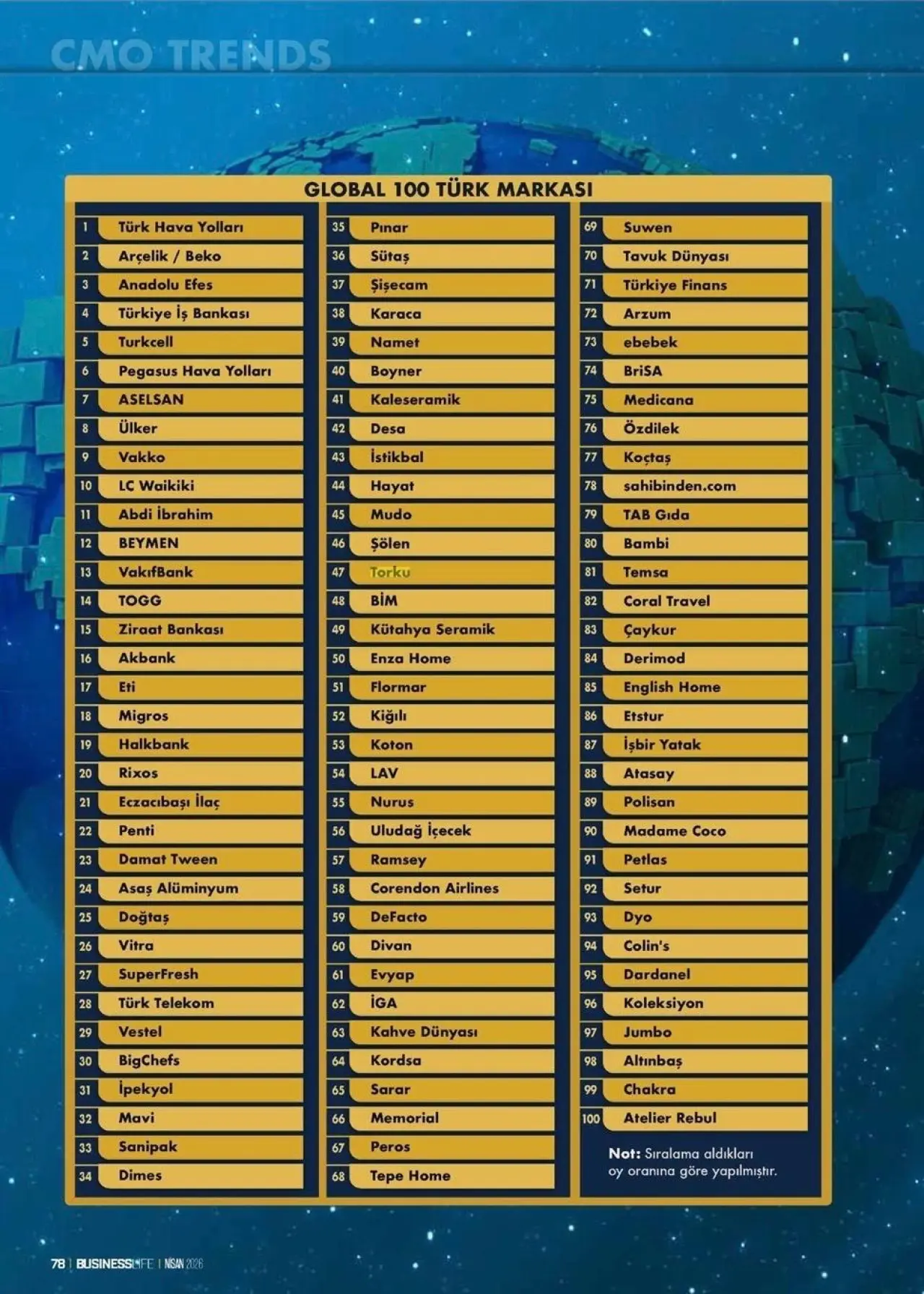 Business Life Dergisi tarafından hazırlanan “Global 100 Türk Markası” araştırmasının 2026 sonuçlarına göre Torku, 47. sırada yer alarak ulusal arenadaki başarısını taçlandırdı.