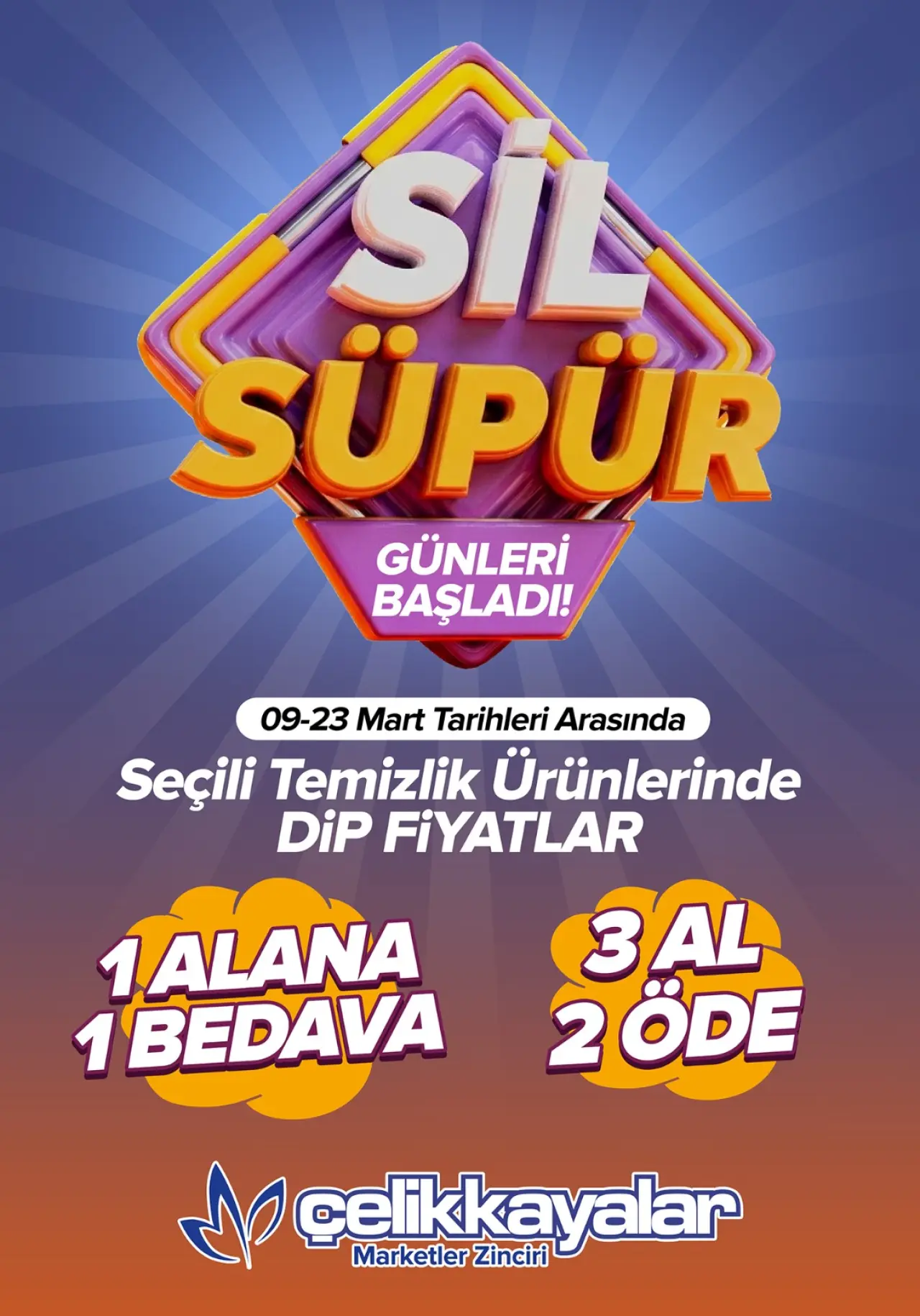 Konya'nın zincir marketi Çelikkayalar, Bayram ve Bahar Temizliğine Özel “Sil Süpür” Kampanyası düzenliyor. Çelikkayalar Marketler Zinciri, yaklaşan bayram ve bahar temizliği hazırlıkları kapsamında 9–23 Mart tarihleri arasında tüm mağazalarında “Sil Süpür” kampanyasını başlattı.