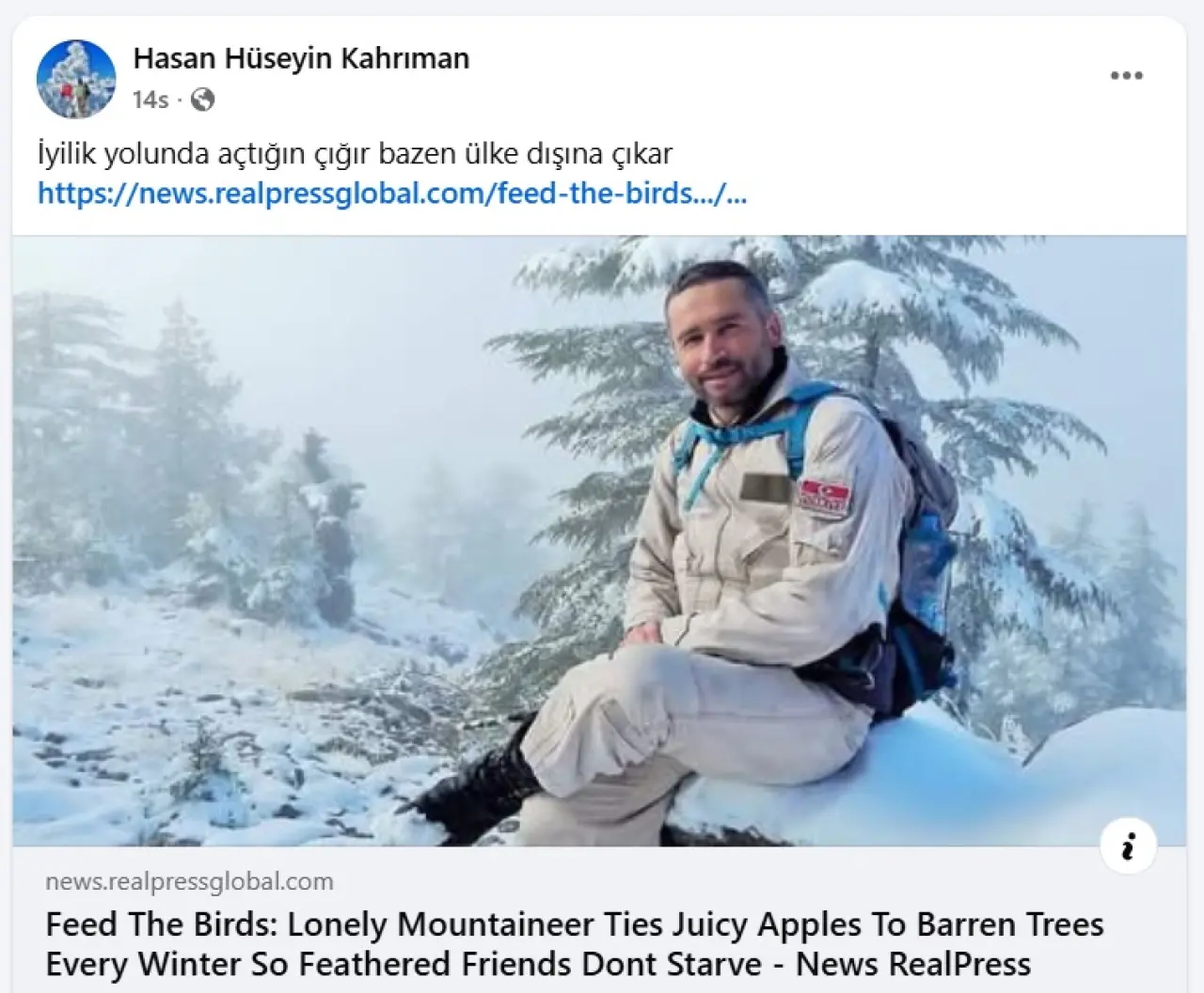 “Yalnız Dağcı olarak bilinen Hasan Hüseyin Kahriman, 20 yılı aşkın bir süredir her kış yanında getirdiği elmaları Konya'daki dağlardaki ağaç dallarına asarak kuşları besliyor” ifadeleriyle Kahriman’ı okuyucularına takdim eden haber siteleri “Türkiye'nin güneybatı-orta kesiminde, Konya ilinde, Toros Dağları'nın kuzey yamaçlarında, yaklaşık 1400 metre (4593 fit) rakımda bulunan Balcılar kasabasında yaşayan Hasan Hüseyin Kahriman, 20 yılı aşkın bir süredir bu işi yapıyor. Bunu, bir kış günü dağda yoğun kar yağışı sırasında bir kuş sürüsünün açlıktan ve soğuktan öldüğüne tanık olmasından buyana yapıyor.