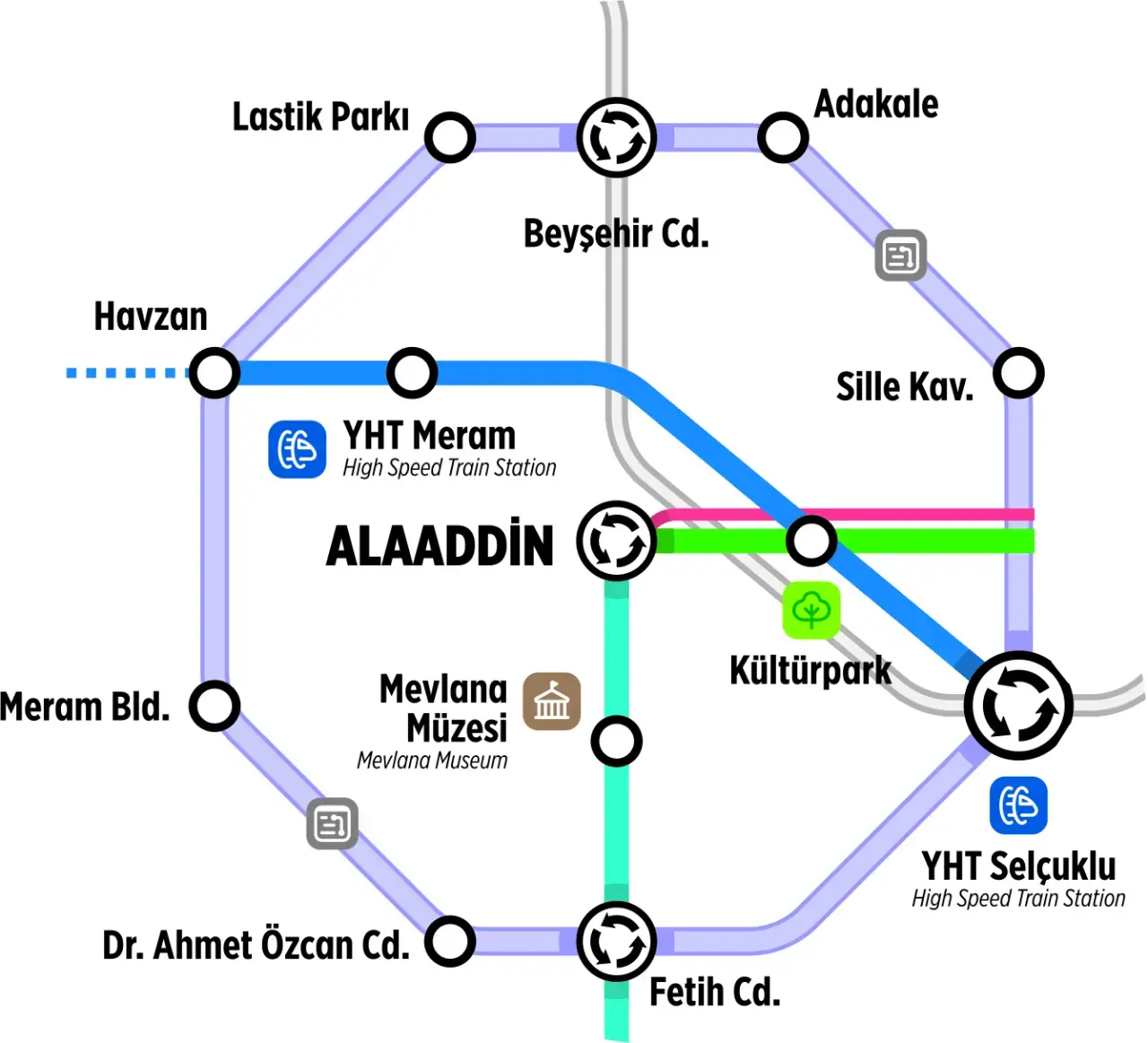 Konya’nın kalbi Meram’ın da ilk tramvay hattı olacak Fetih Caddesi- Ahmet Özcan Caddesi Hattı; Belh Kavşağı’ndan başlayıp Fetih Caddesini boylu boyunca kat edecek ve Ahmet Özcan Caddesi ile kesişip sırasıyla Meram Belediyesi-Havzan (Meram Gar)-Lastik Parkı (Sivaslı Ali Kemal Caddesi)-Beyşehir Caddesi-Adakale Caddesi-Sille Kavşağı-Selçuklu YHT Garı ve Belh Kavşağı şeklinde ring hattı oluşturacak. Merkezde kesişme noktası olacak Fetih Caddesi Tramvay Hattı ile Konya raylı sistem ağının en efektif biçimde hizmet vermesi sağlanacak.