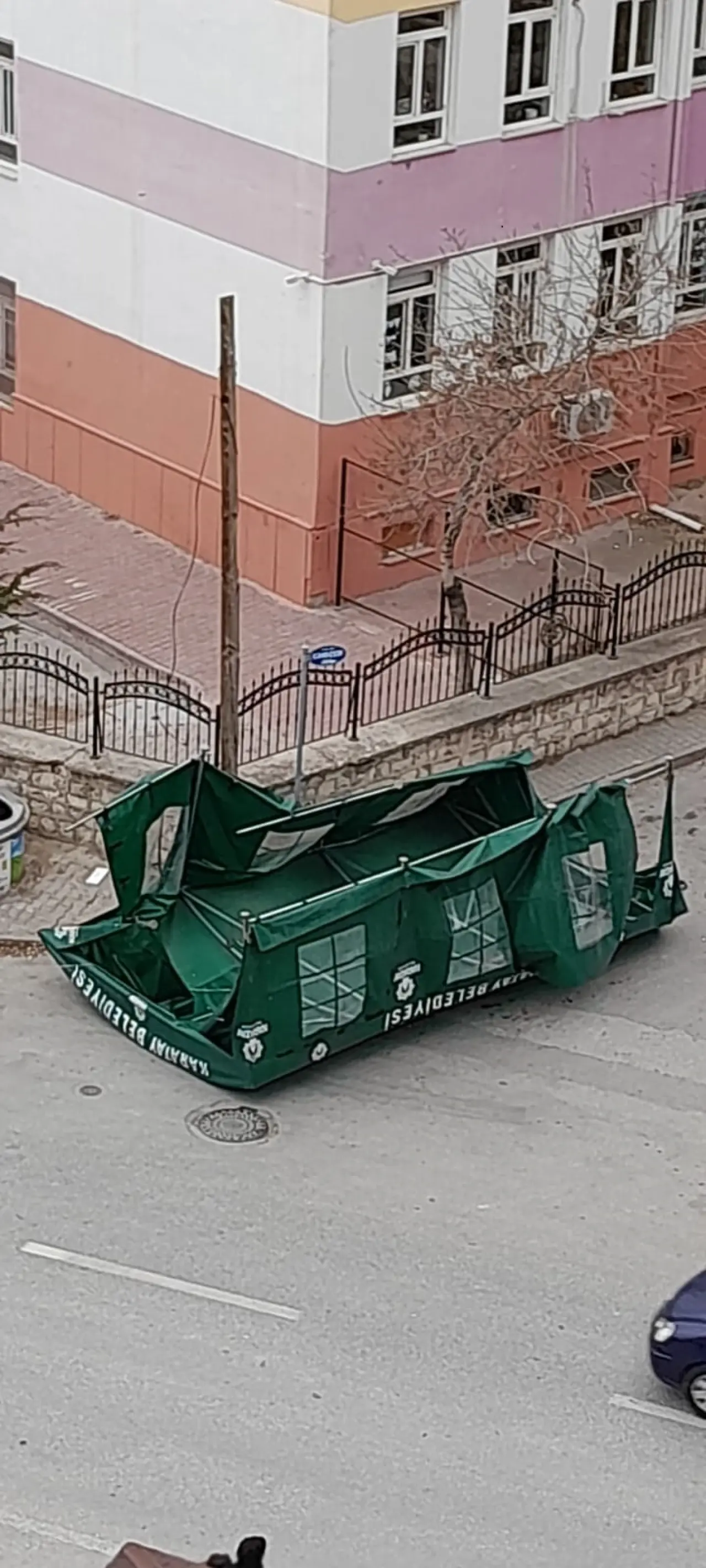Konya'da etkili olan fırtına sebebiyle vatandaşlar zor anlar yaşıyor. Şiddetli rüzgarın hızıyla cadde ve sokaklardaki çok sayıda ağaç ile çöp kovası devrilerek çevreye savruldu. Karatay'da bir cenaze çadırı ise şiddetli lodostan nasibini aldı. Taziye çadırı ve çok sayıda sandalye devrilerek çevreye savruldu.